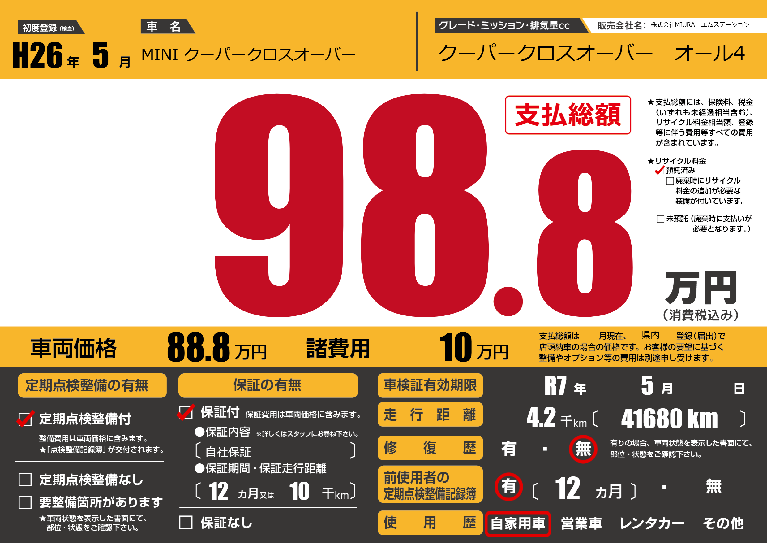 | 車名 | MINI クーパークロスオーバー | グレード ミッション 排気量 |