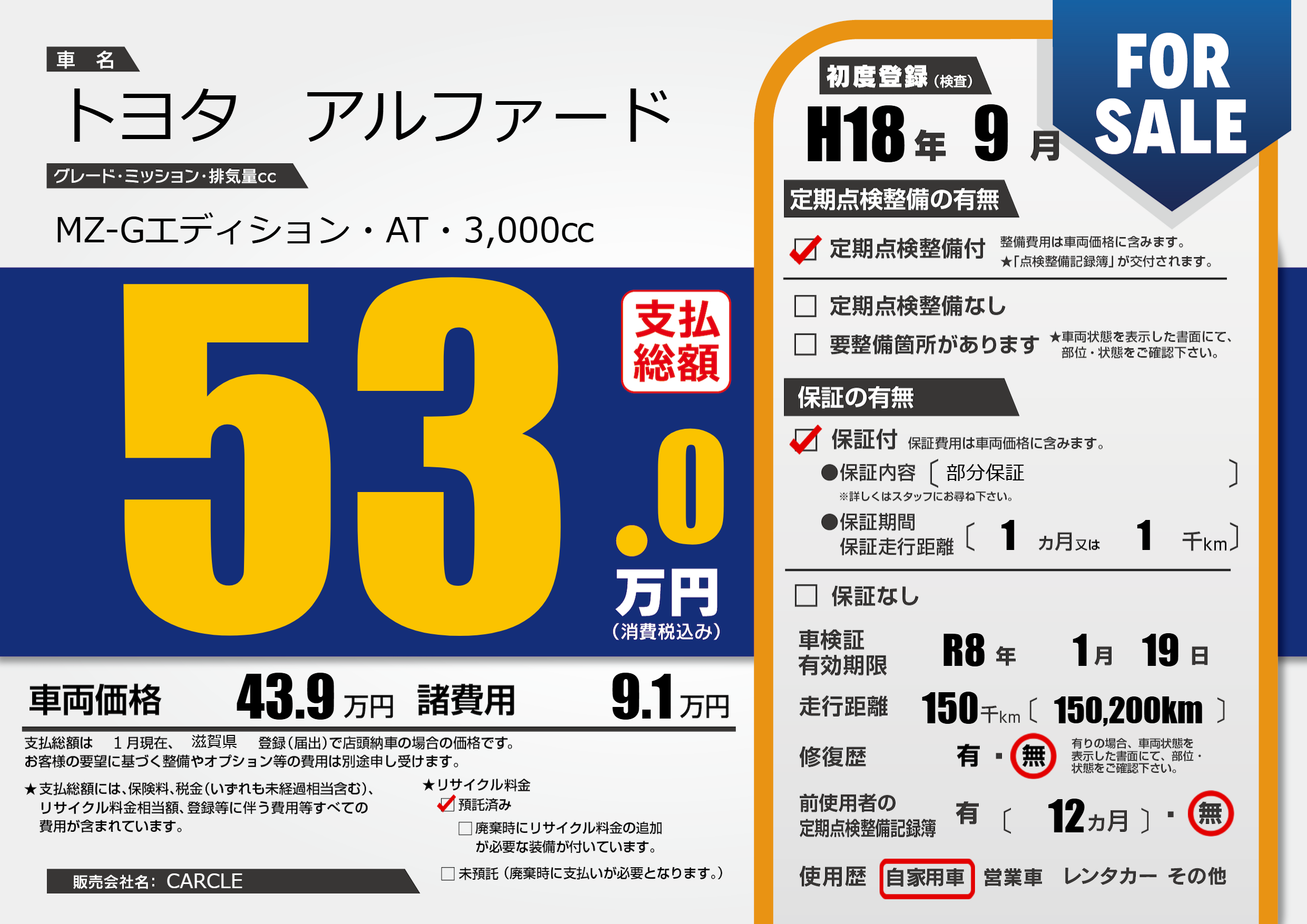 | 走行キロ | 15万km | 初年度登録 | H18年9月 |