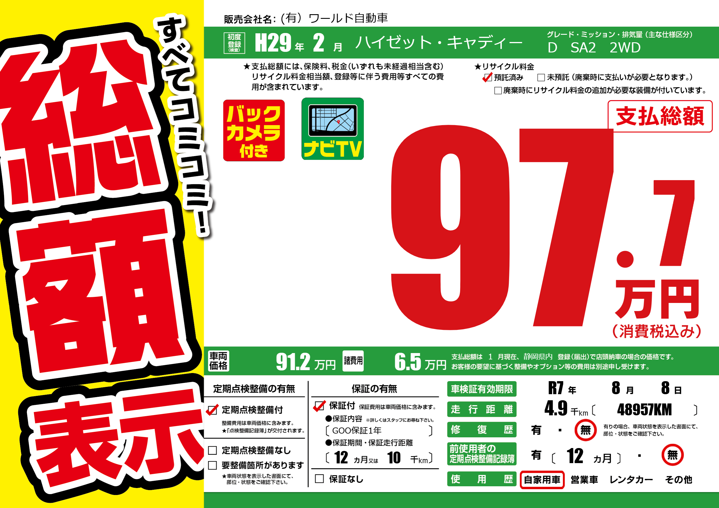 | 車名 | ハイゼット・キャディー | グレード ミッション 排気量 |