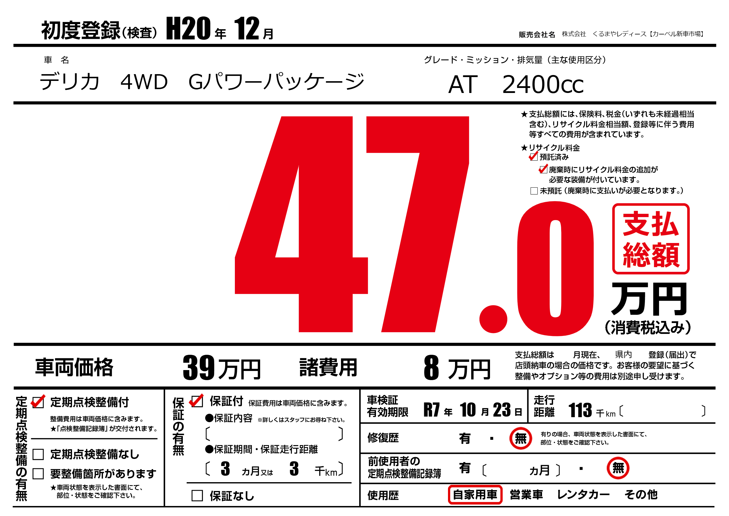 | 車名 | デリカ 4WD Gパワーパッケージ | グレード ミッション 排気量 |