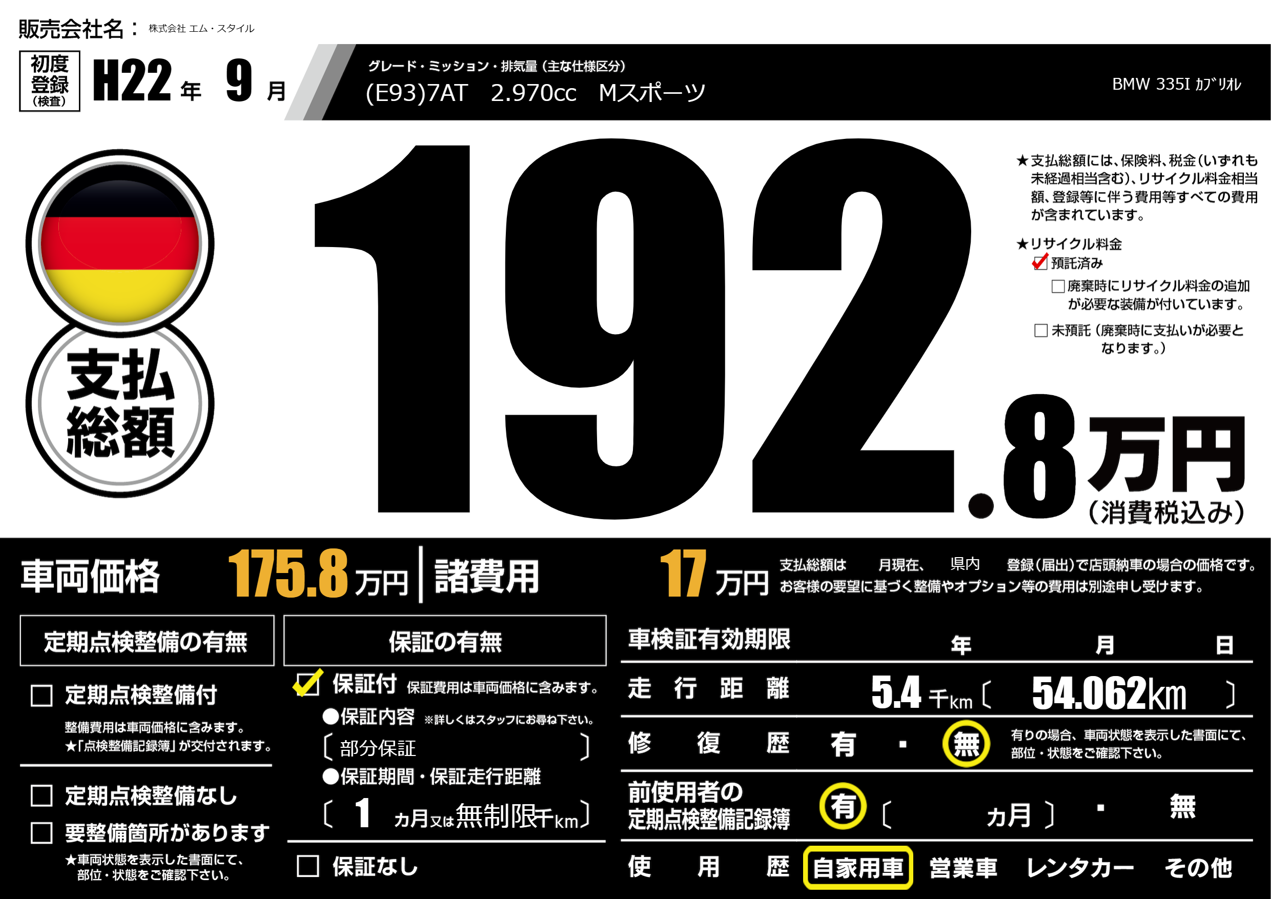 | 車名 | BMW 335I カブリオレ | グレード ミッション 排気量 |