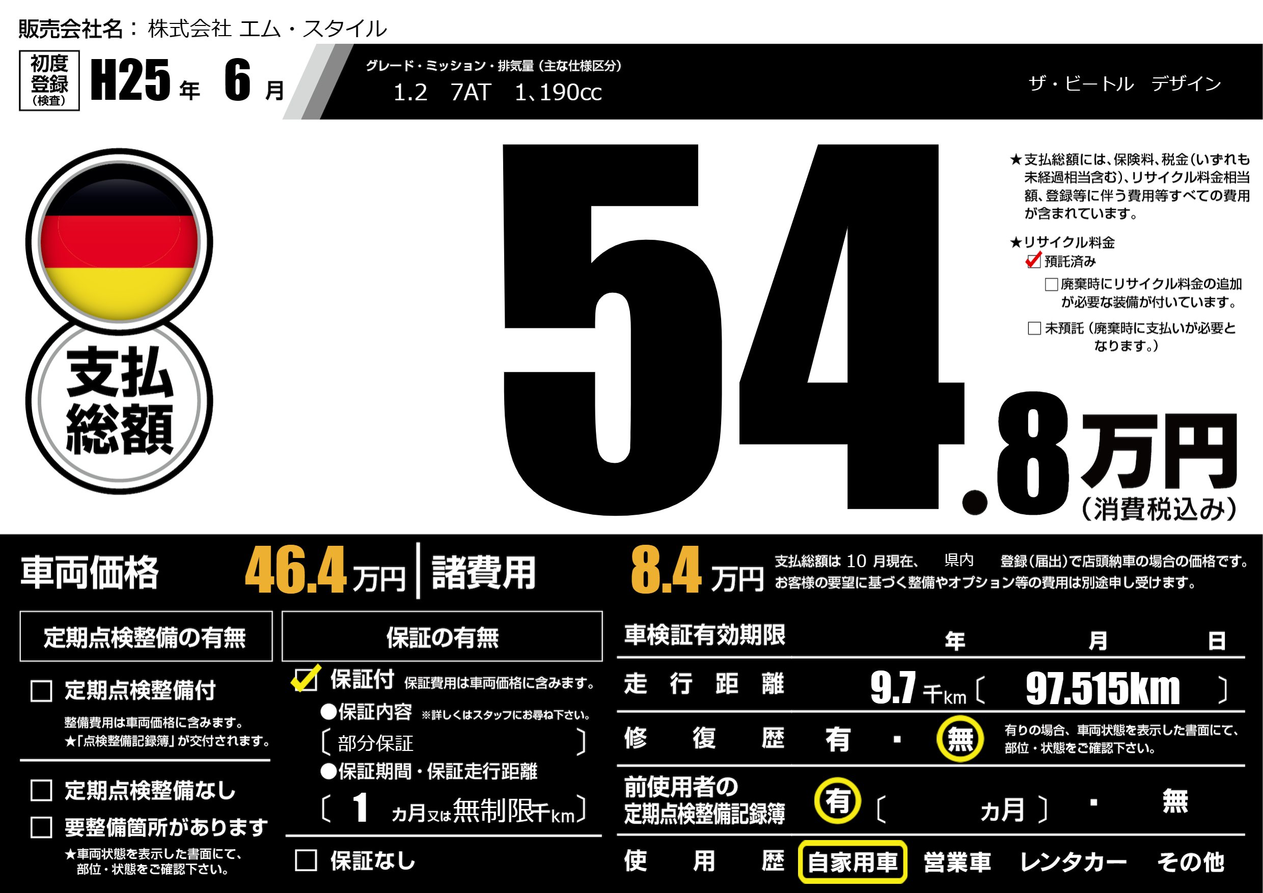 | 走行キロ | 0.9万km | 初年度登録 | H25年6月 |