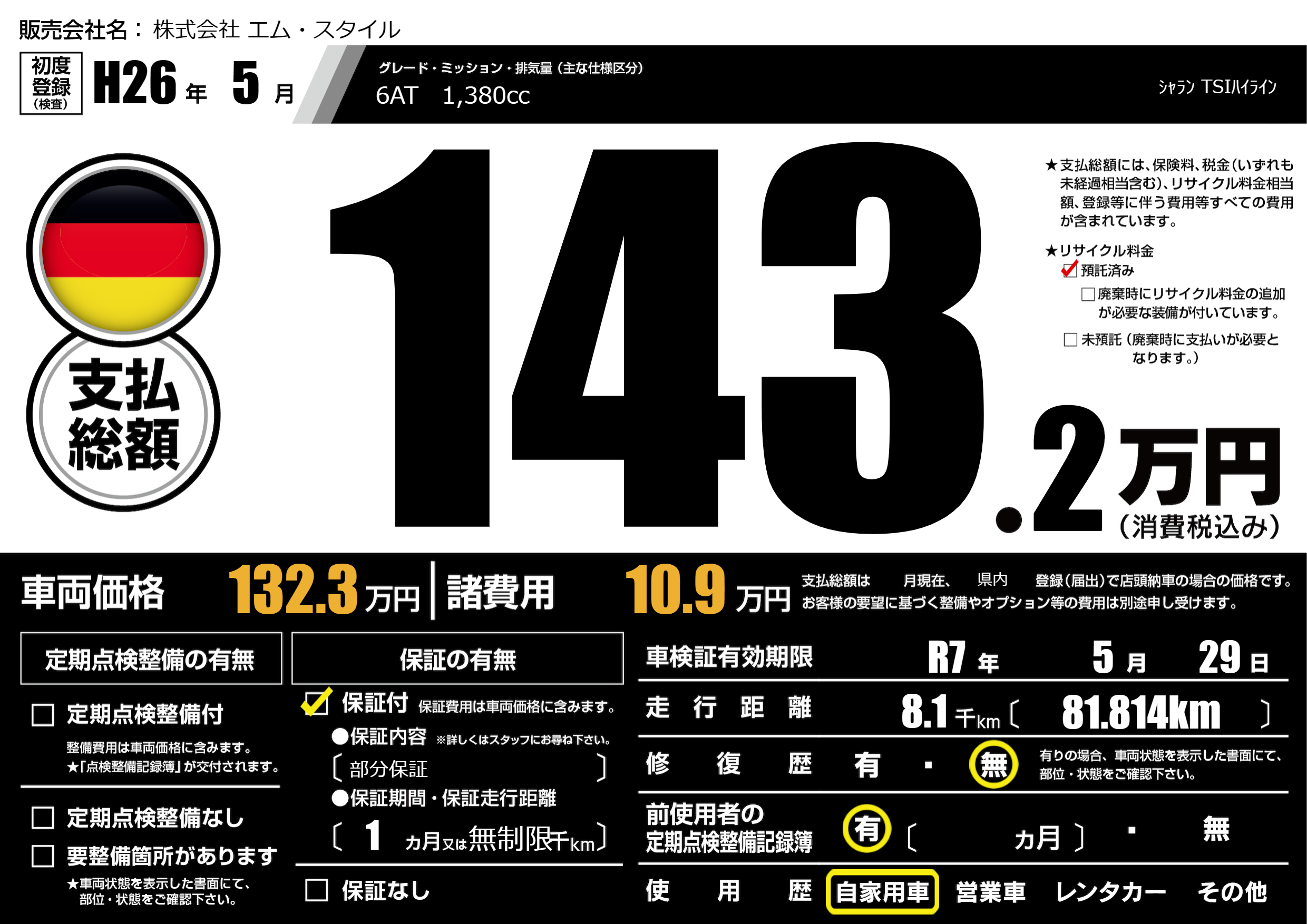 | 車名 | シャラン TSIハイライン | グレード ミッション 排気量 |