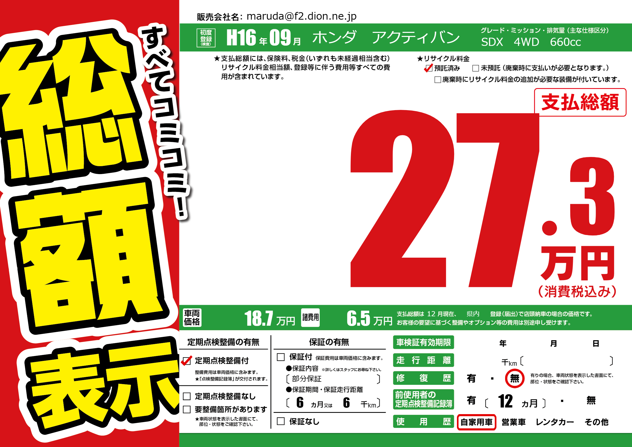 | 車名 | ホンダ アクティバン | グレード ミッション 排気量 |