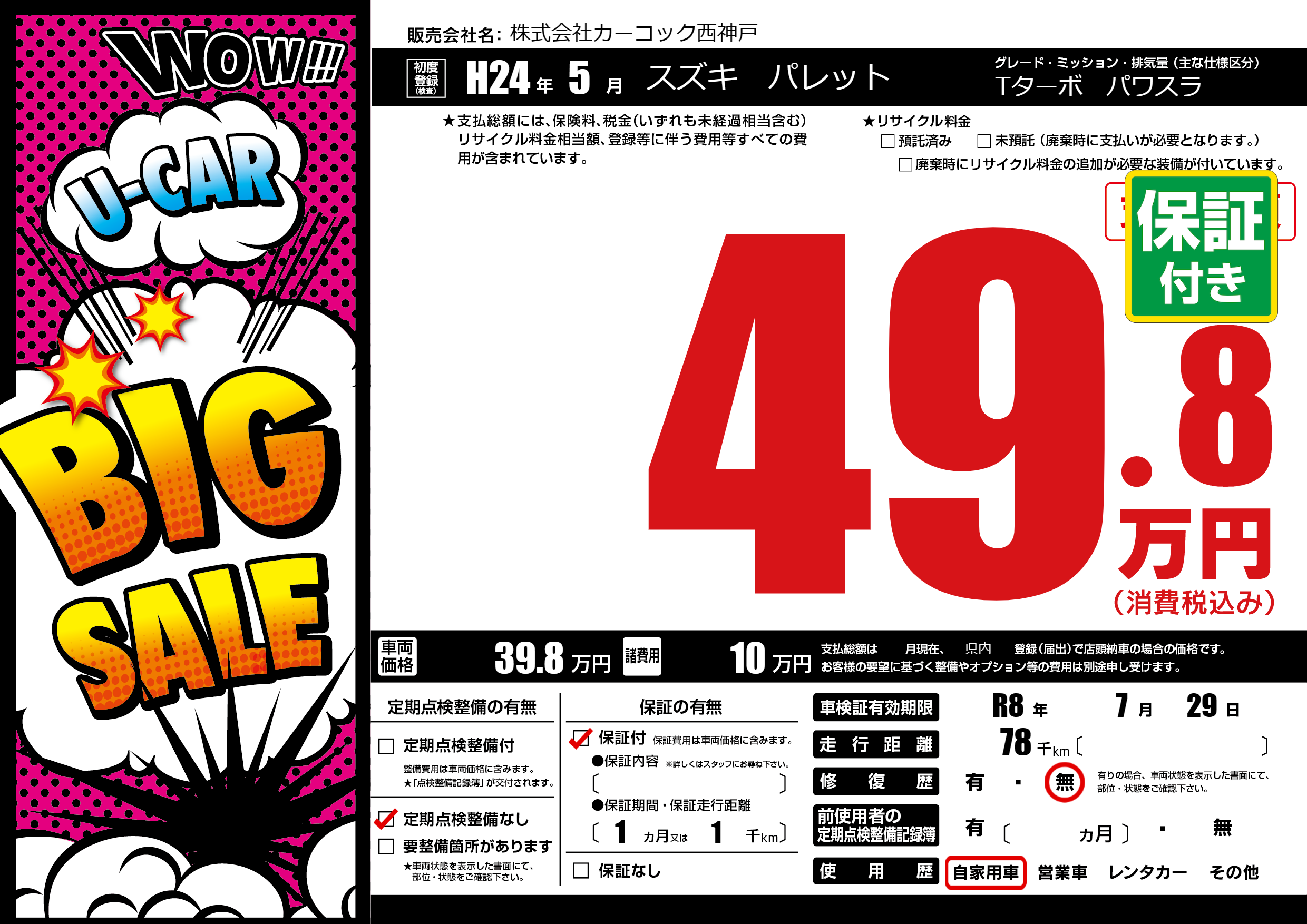 | 車名 | スズキ パレット | グレード ミッション 排気量 |