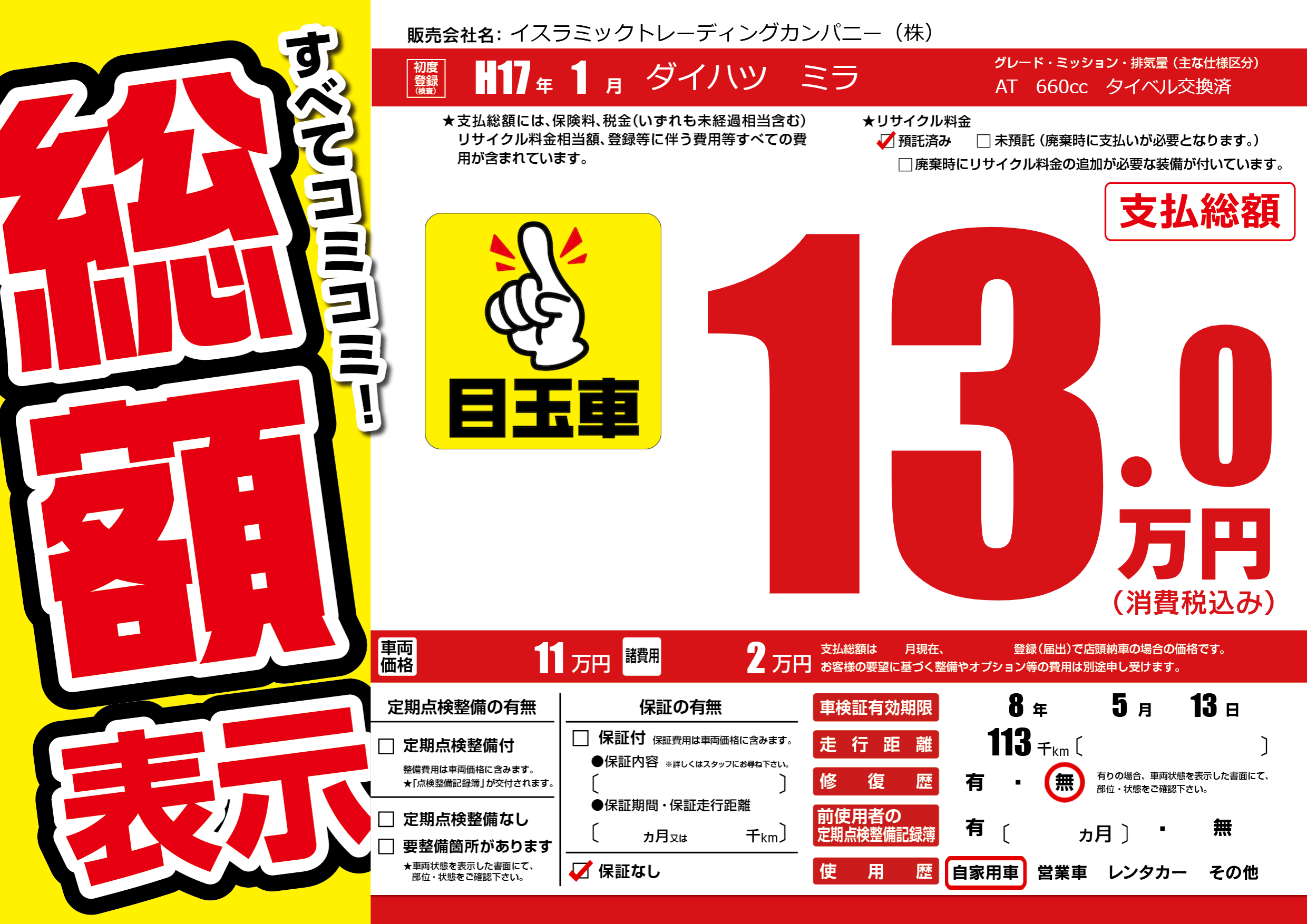 | 走行キロ | 11.3万km | 初年度登録 | H17年1月 |