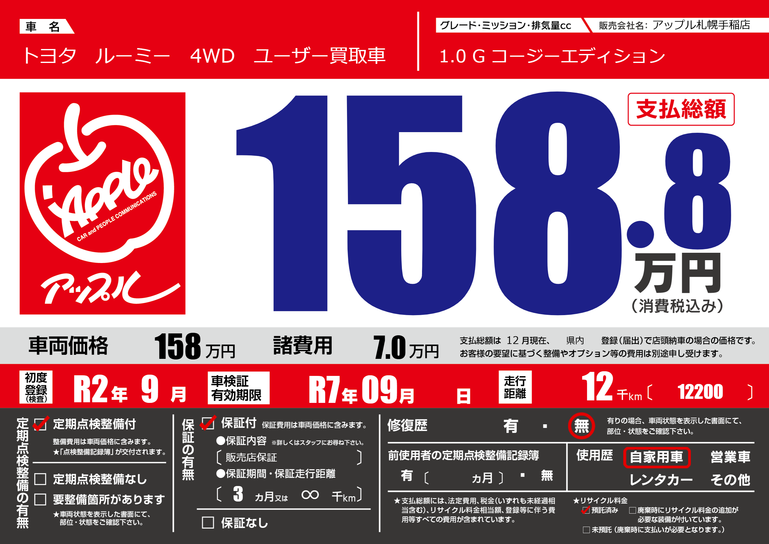 | 車名 | トヨタ ルーミー 4WD ユーザー買取車 | グレード ミッション 排気量 |