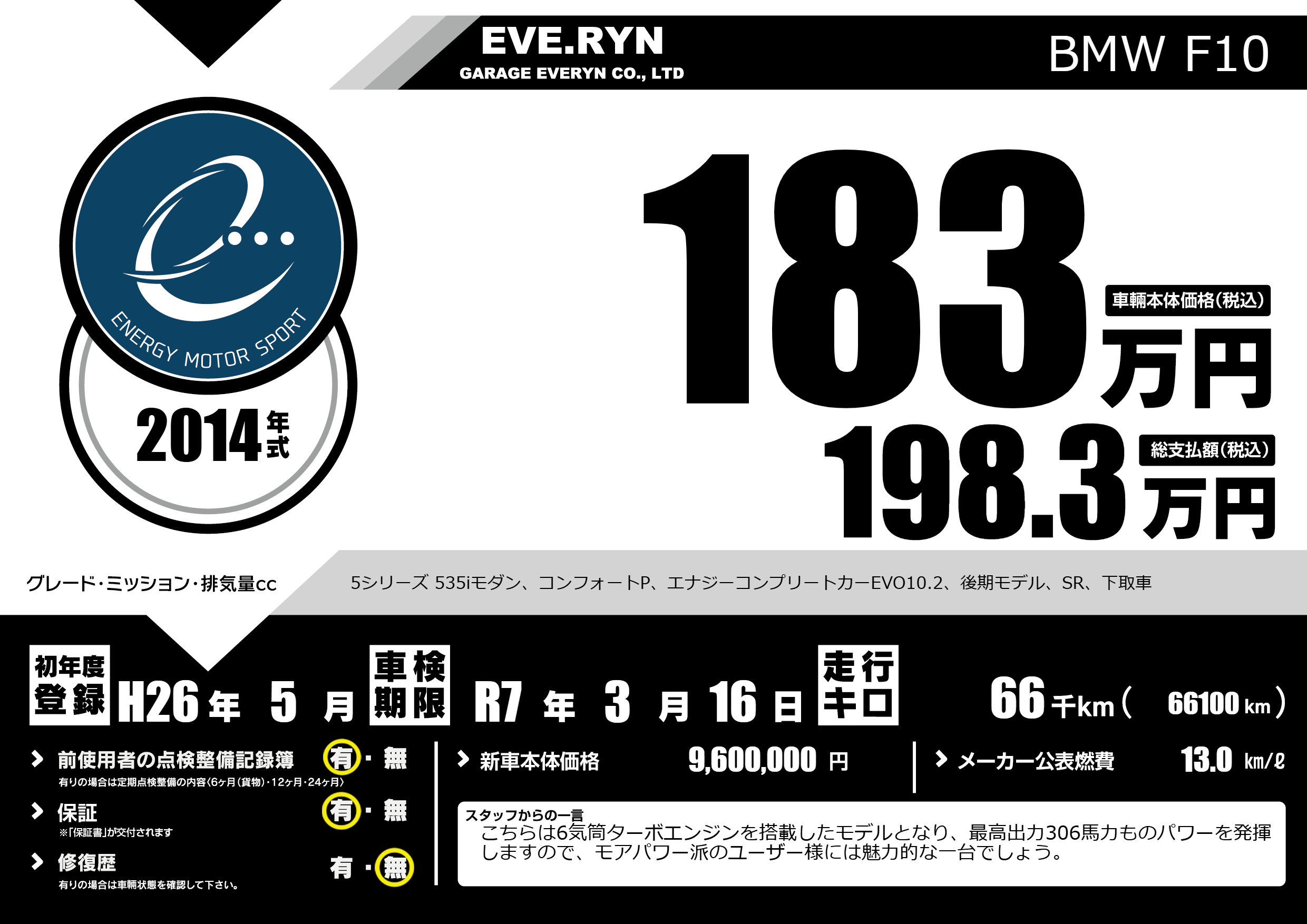 5シリーズ 535iモダン、コンフォートP、エナジーコンプリートカーEVO10.2、後期モデル、SR、下取車 |