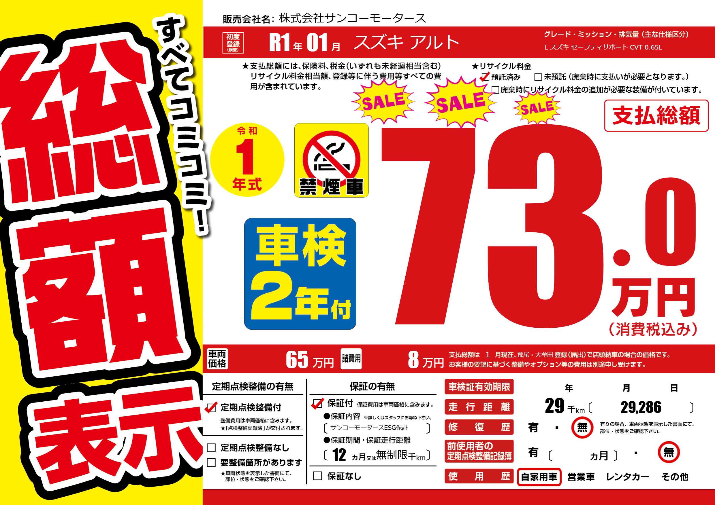 保証付き 保証内容(サンコーモータースESG保証) 12ヶ月または無制限千km |