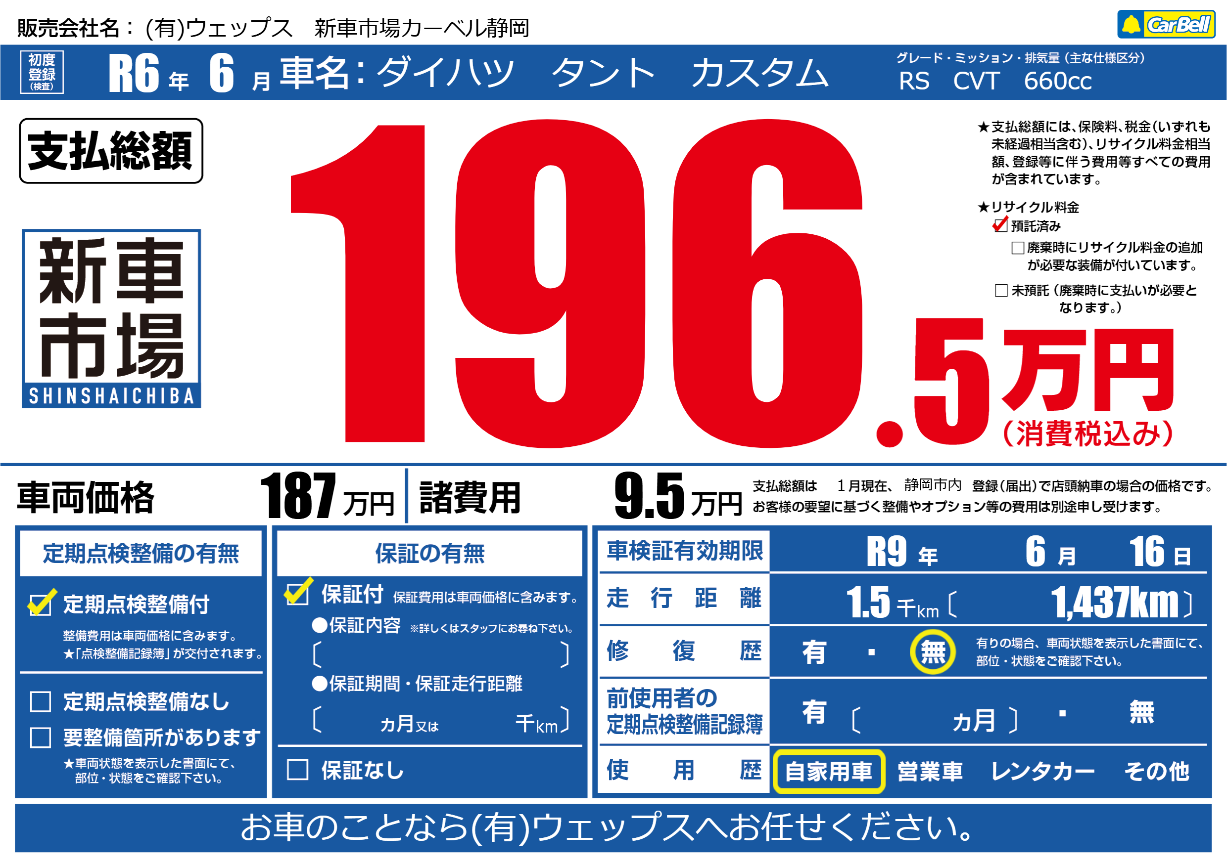 | 走行キロ | 0.1万km | 初年度登録 | R6年6月 |