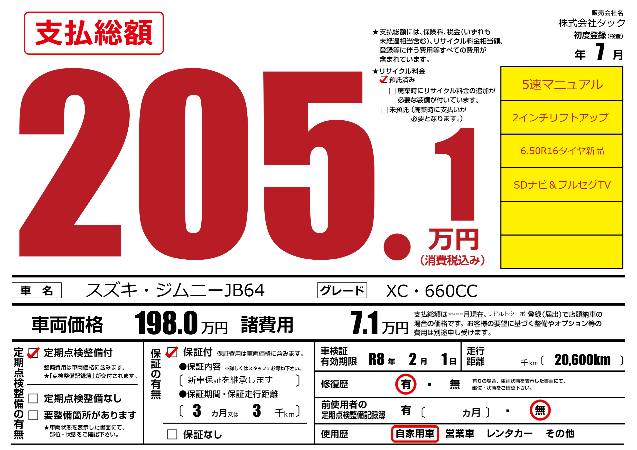 | 車名 | スズキ・ジムニーJB64 | グレード ミッション 排気量 |