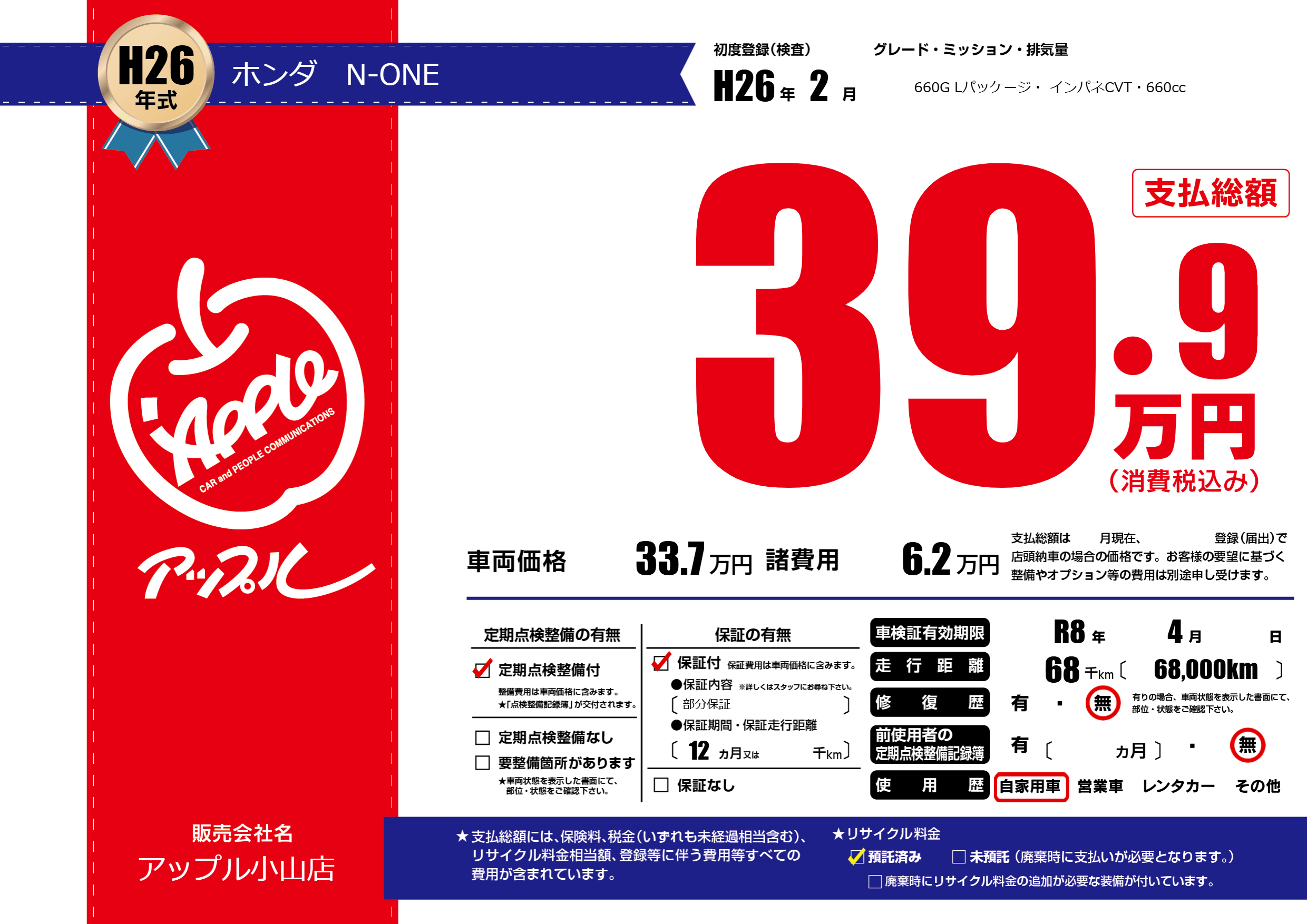 | 車名 | ホンダ N-ONE | グレード ミッション 排気量 |
