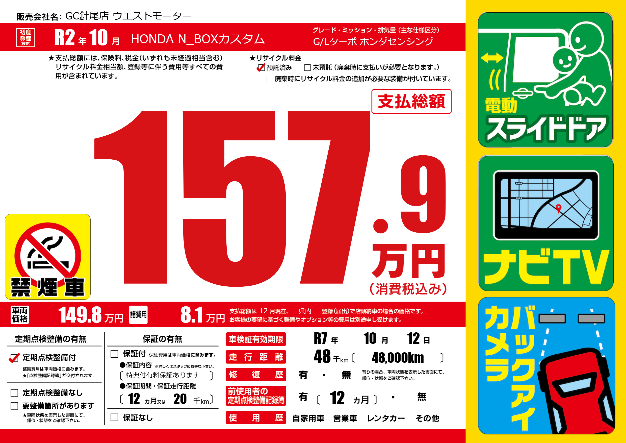 | 車名 | HONDA N_BOXカスタム | グレード ミッション 排気量 |