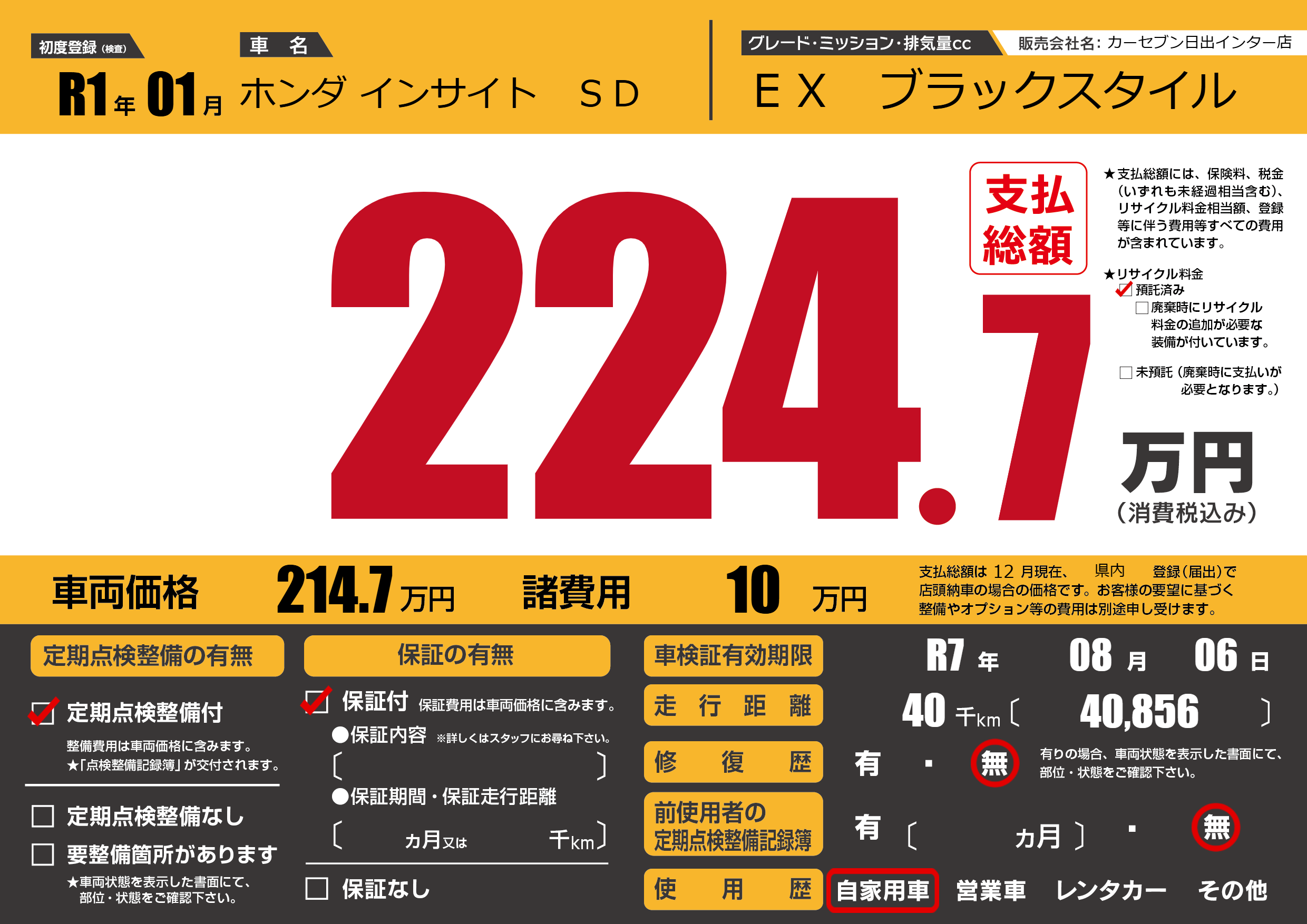 | 車名 | ホンダ インサイト SD | グレード ミッション 排気量 |