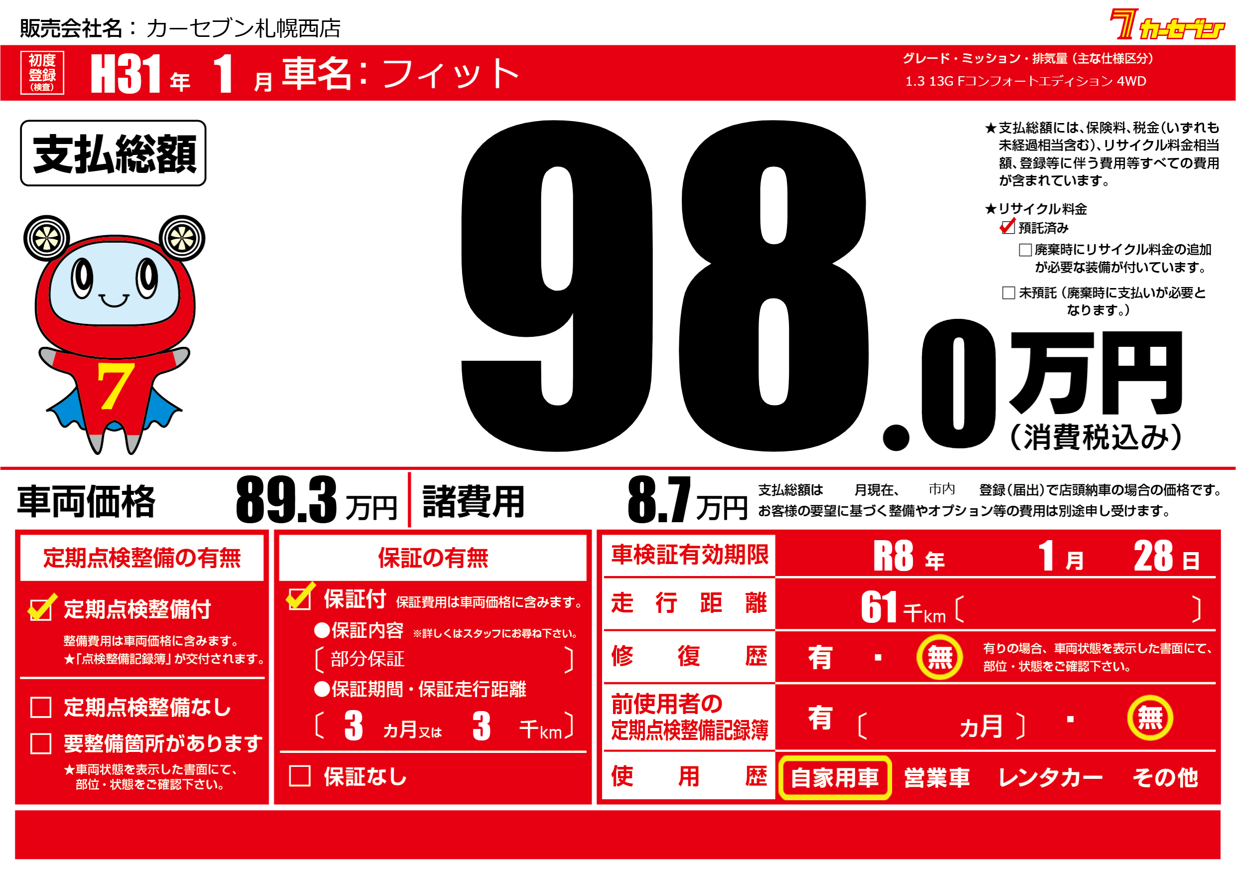 | 走行キロ | 6.1万km | 初年度登録 | H31年1月 |