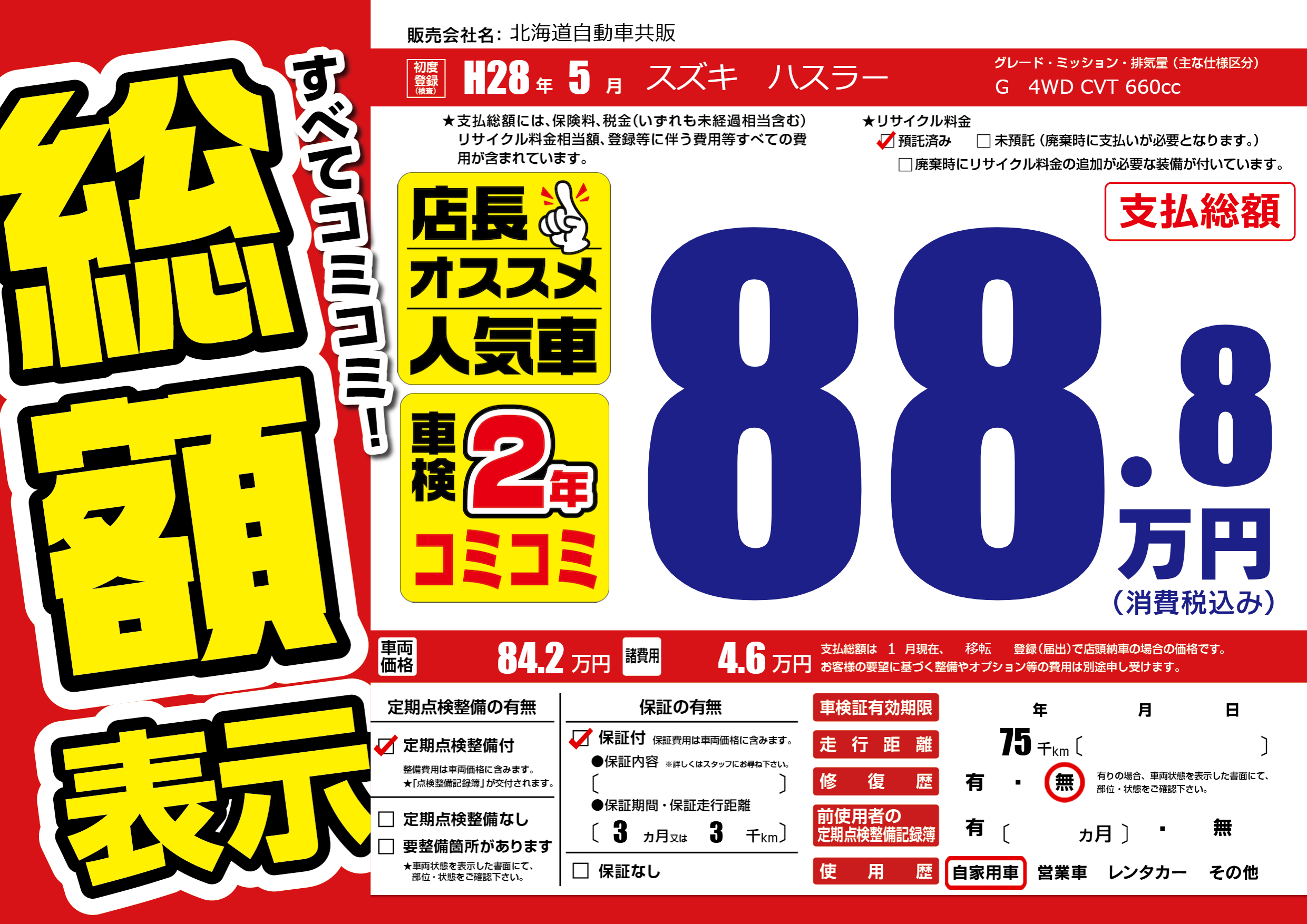 | 車名 | スズキ ハスラー | グレード ミッション 排気量 |