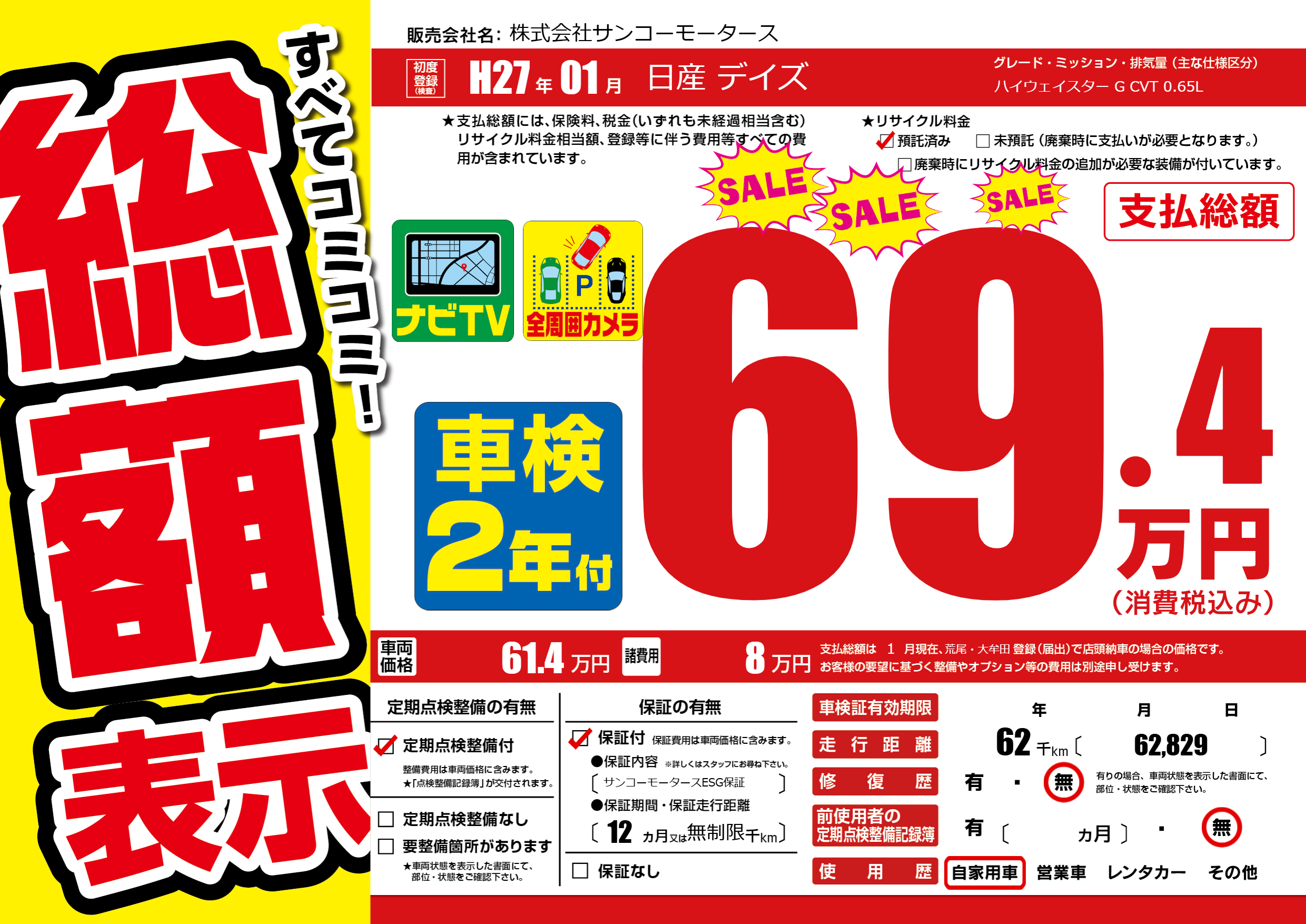保証付き 保証内容(サンコーモータースESG保証) 12ヶ月または無制限千km |