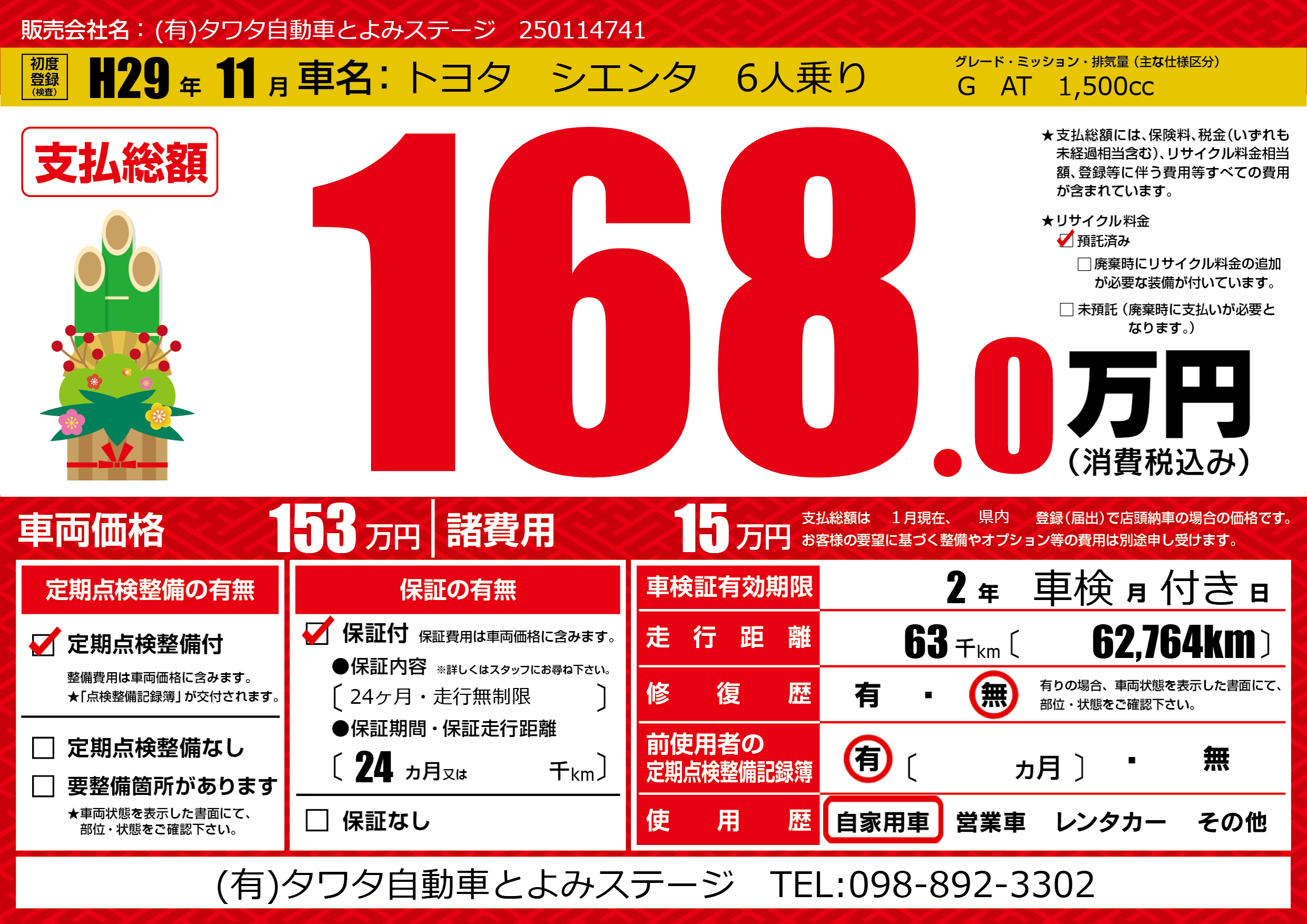 | 車名 | トヨタ シエンタ 6人乗り | グレード ミッション 排気量 |