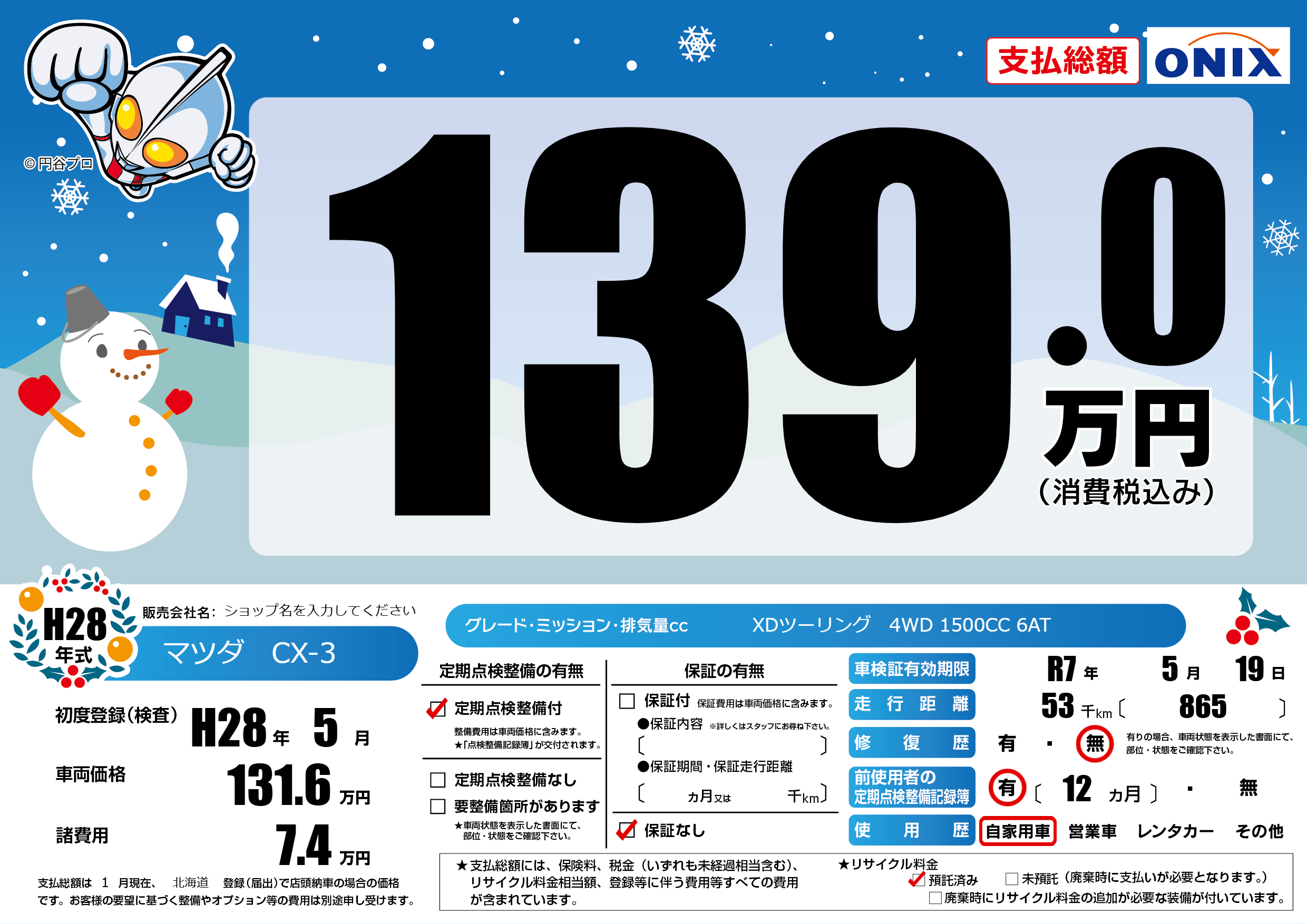 | 車名 | マツダ CX-3 | グレード ミッション 排気量 |