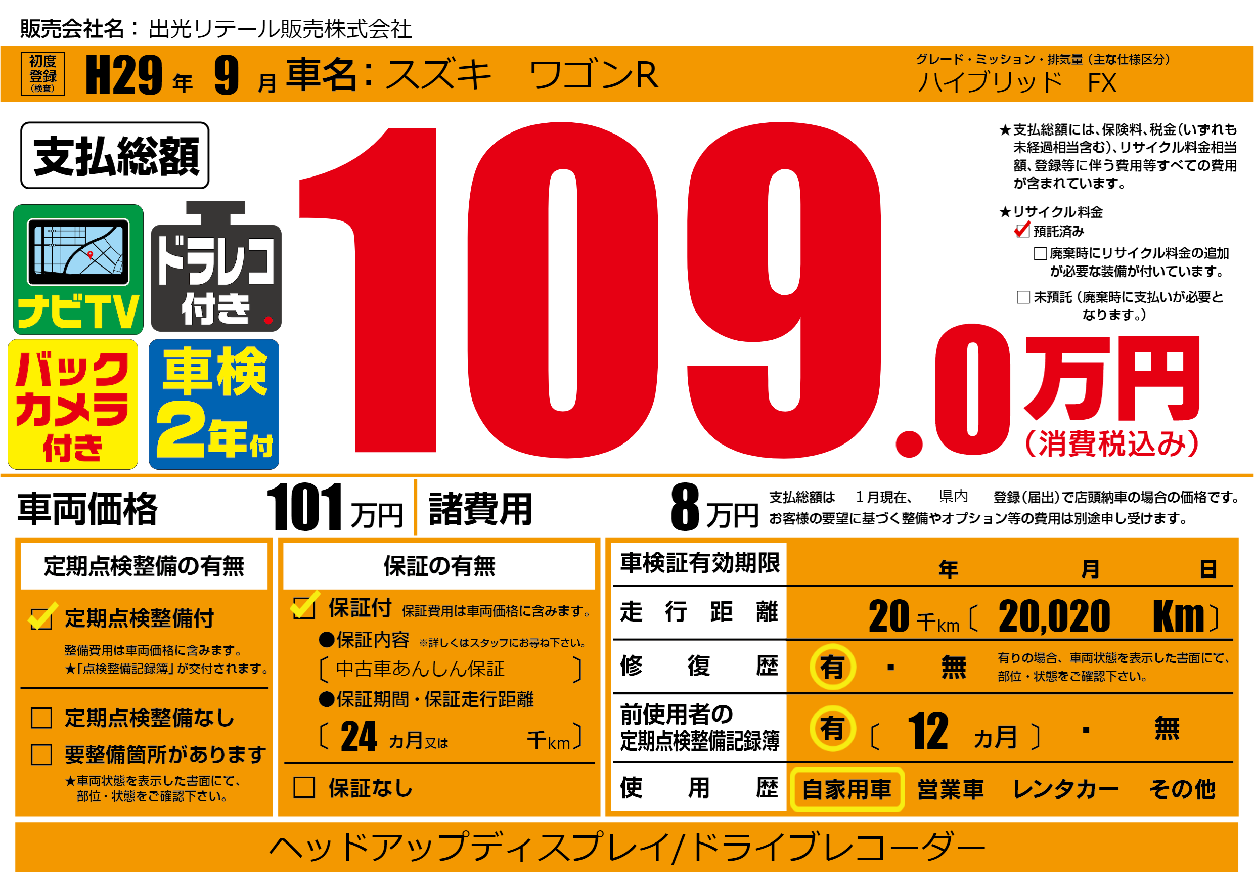 | 走行キロ | 2万km | 初年度登録 | H29年9月 |