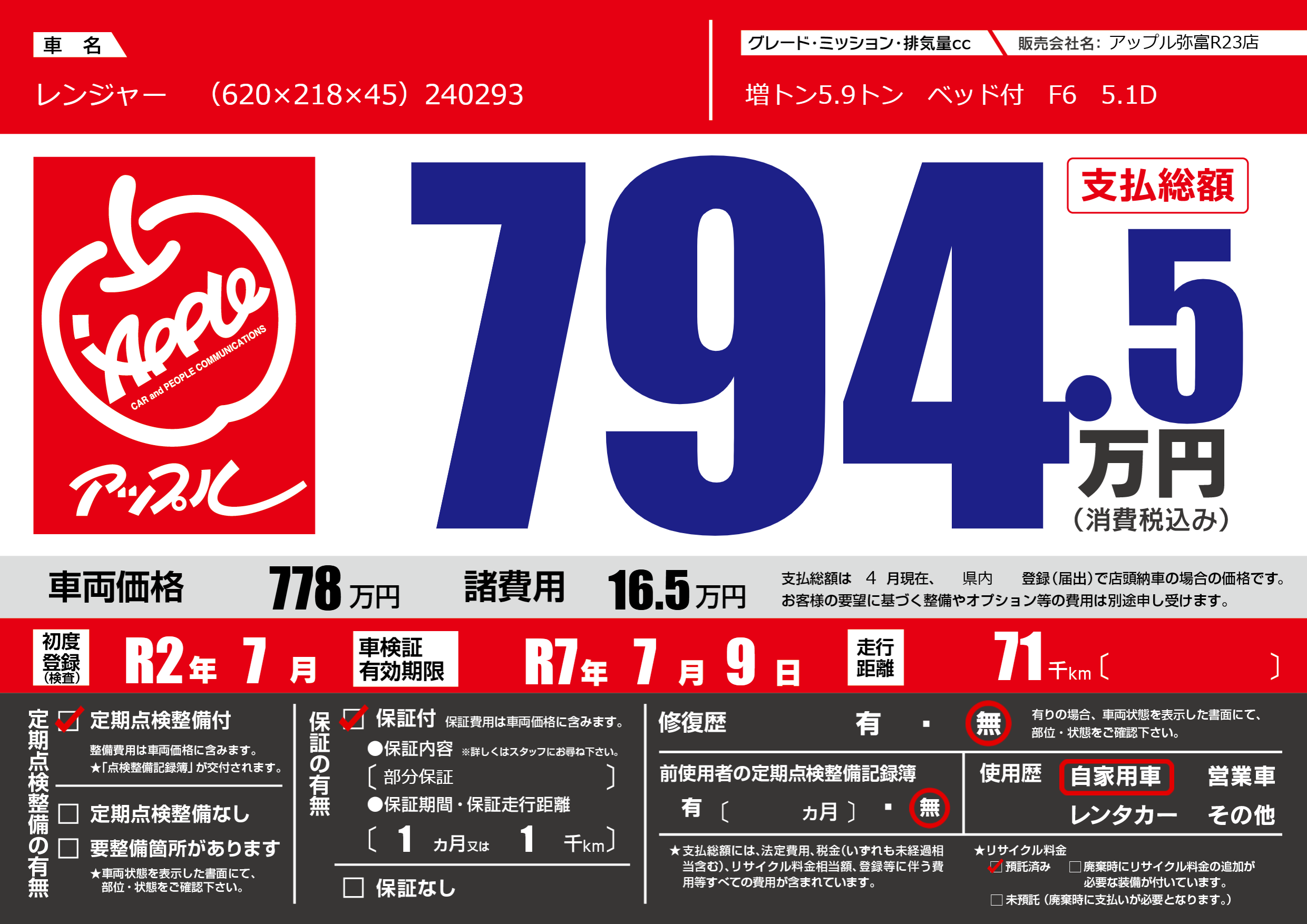 なし | 車検制限 | R7年7月9月 |