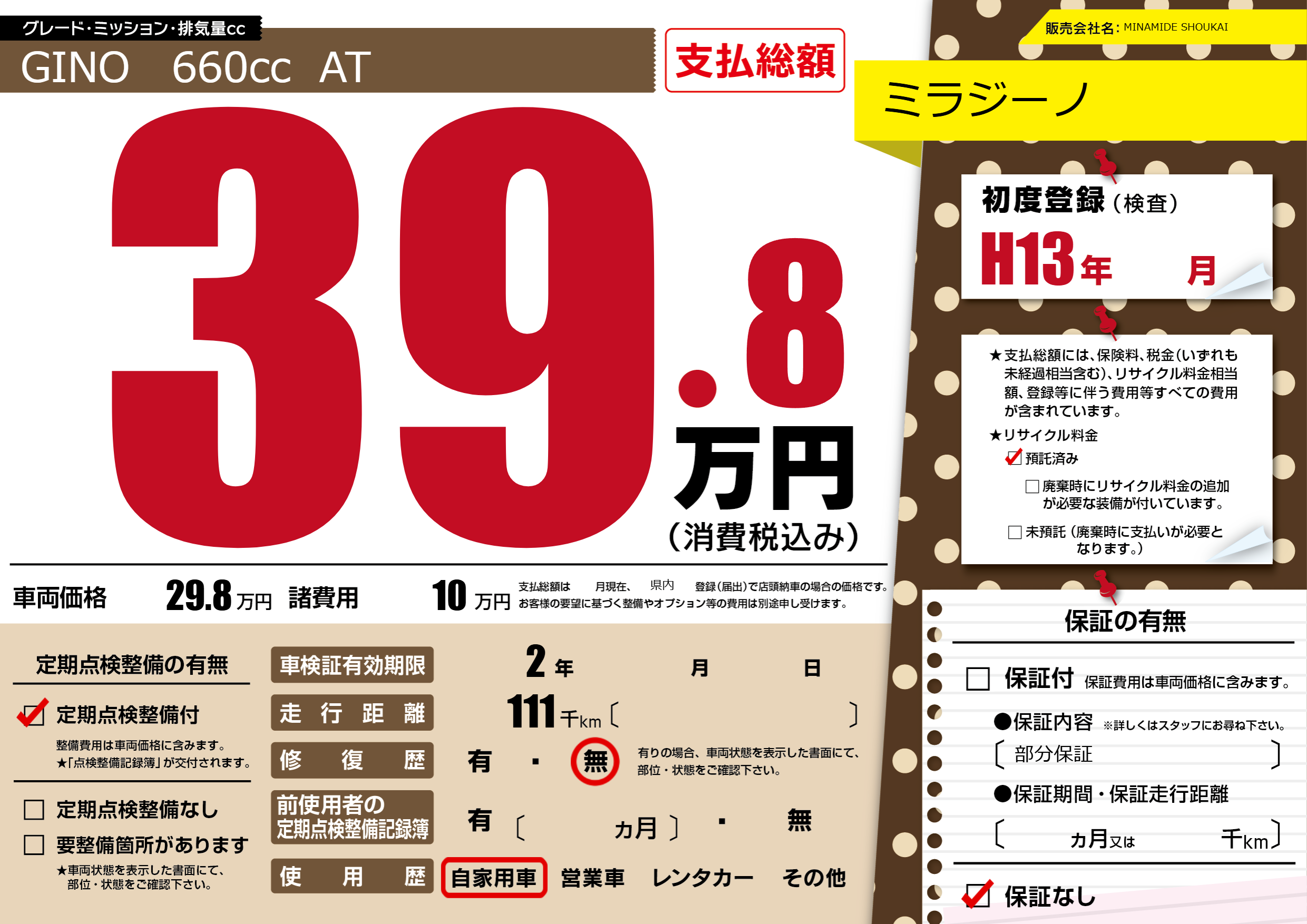 保証なし 保証内容(部分保証) ---ヶ月または()千kmまで |