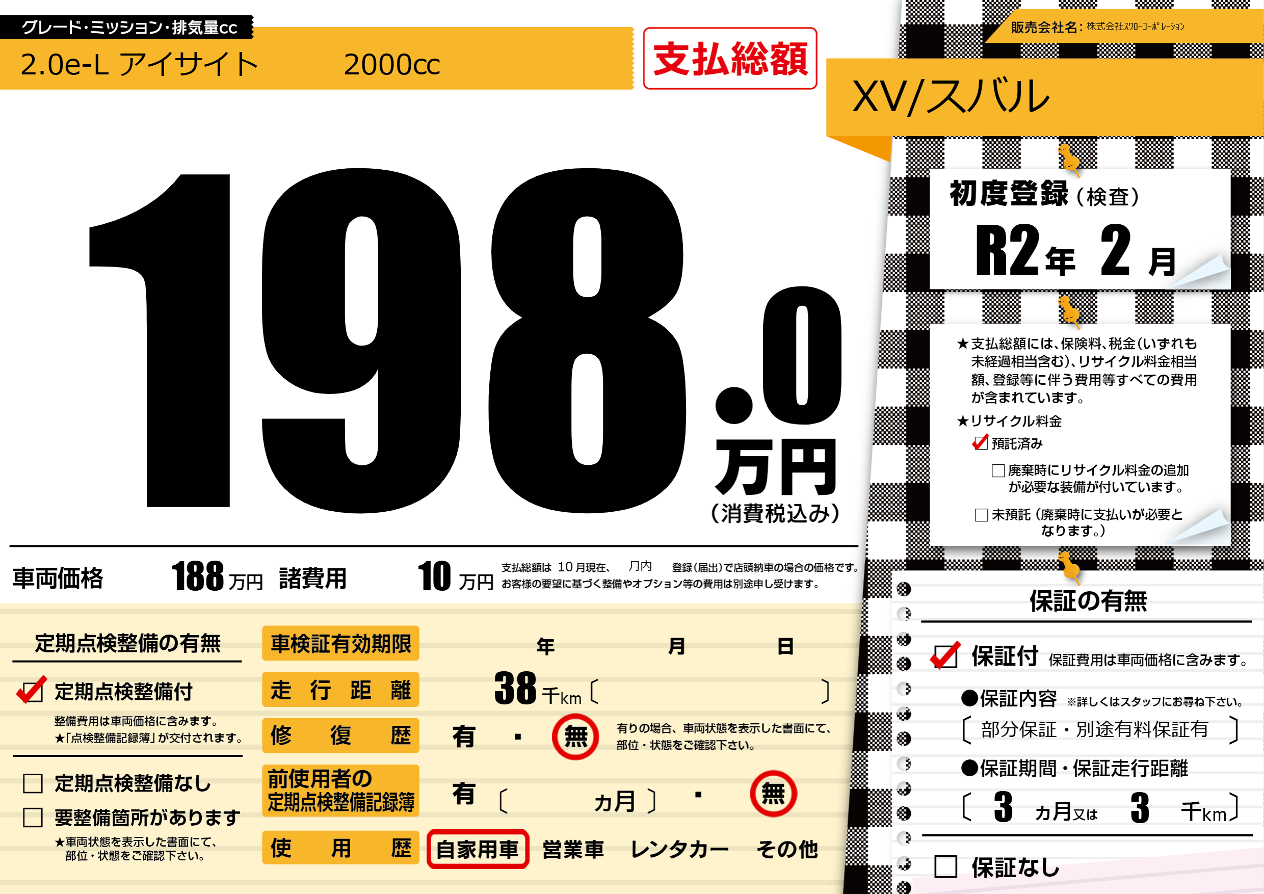 | 車名 | XV/スバル | グレード ミッション 排気量 |