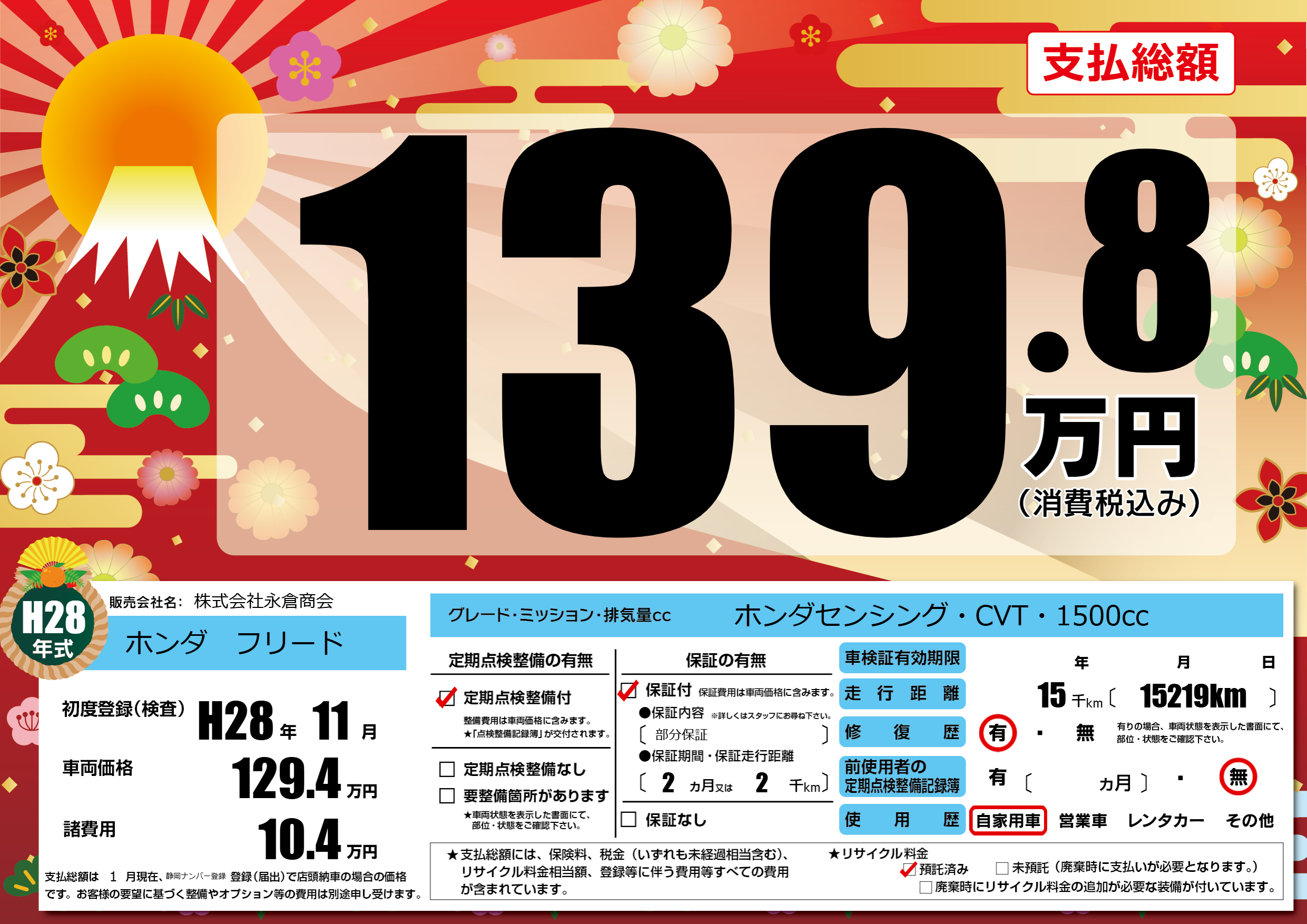 | 車名 | ホンダ フリード | グレード ミッション 排気量 |