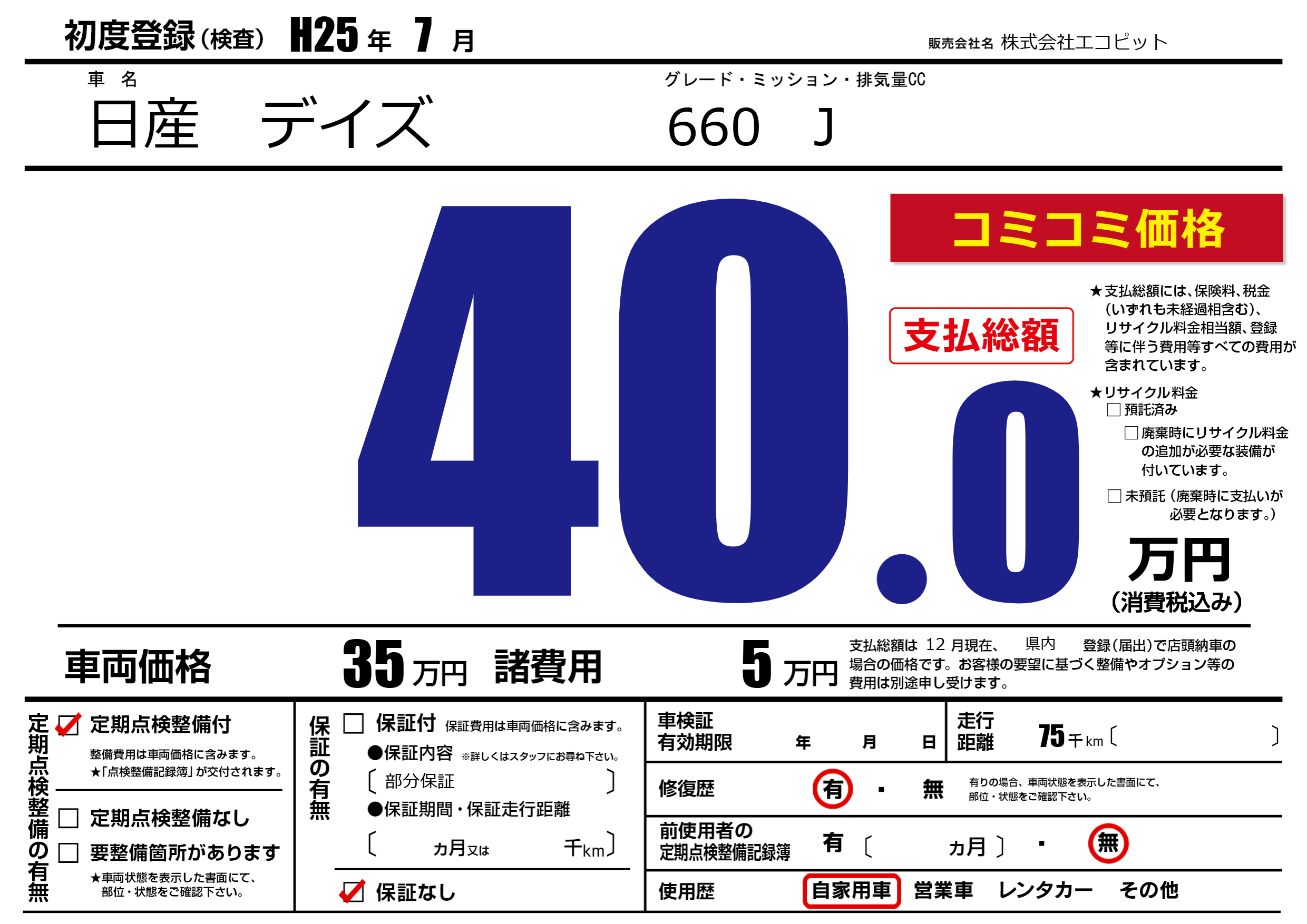 | 定期点検整備 | 定期点検整備あり | ||