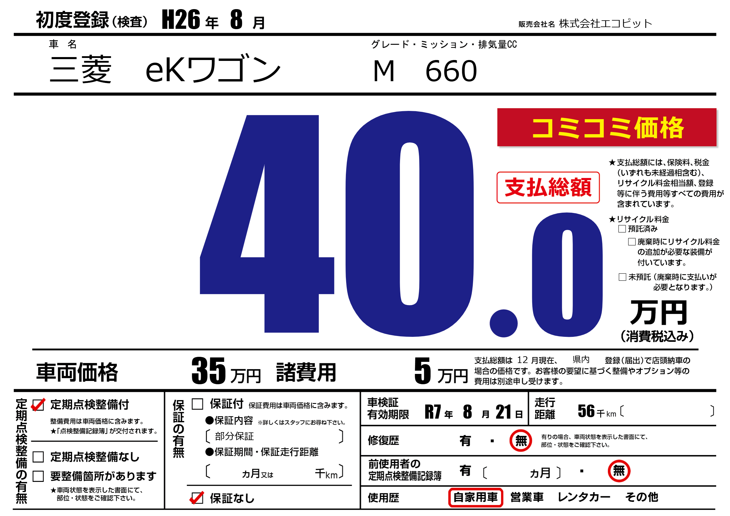 | 車名 | 三菱 eKワゴン | グレード ミッション 排気量 |