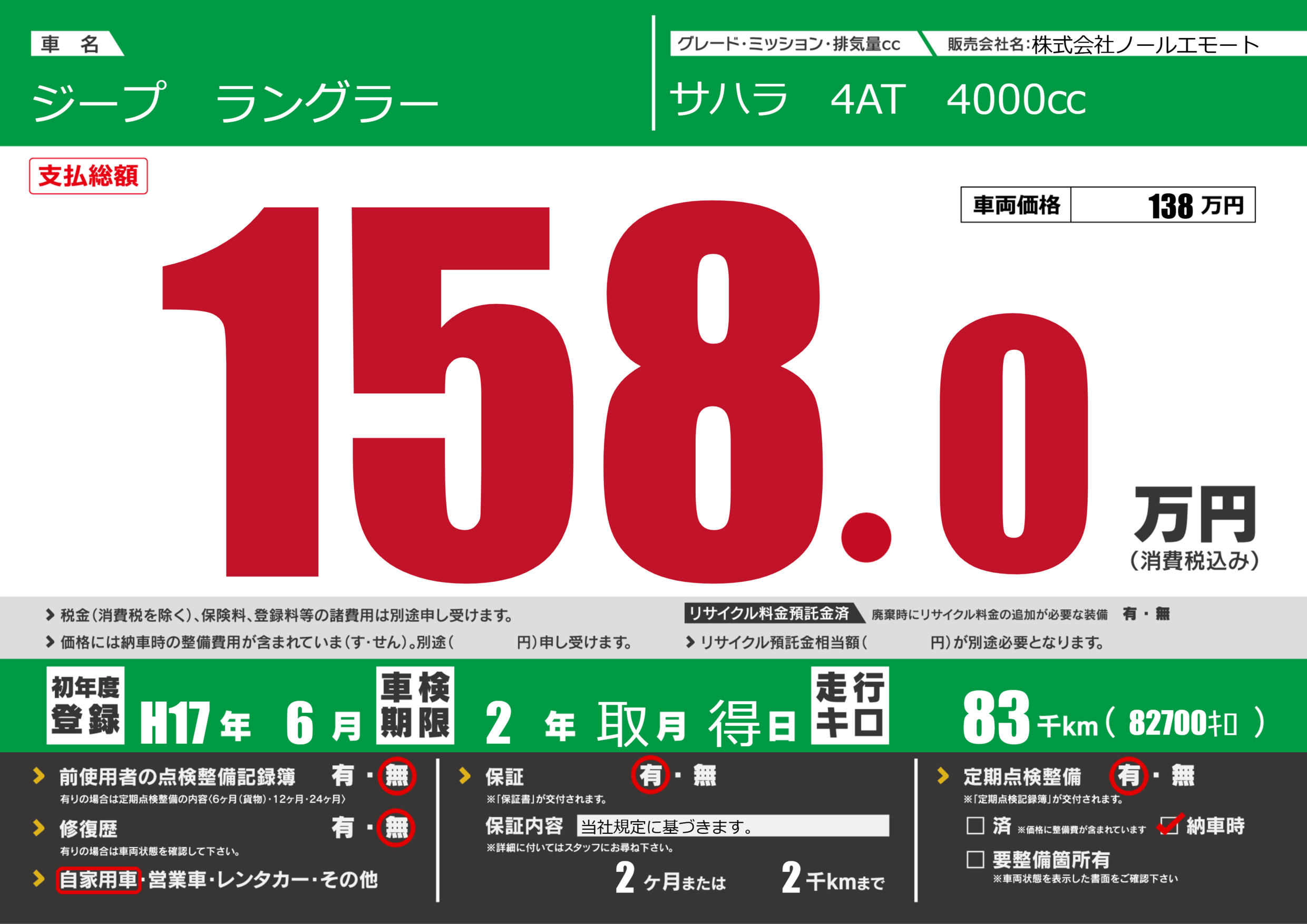 | 走行キロ | 8.3万km | 初年度登録 | H17年6月 |
