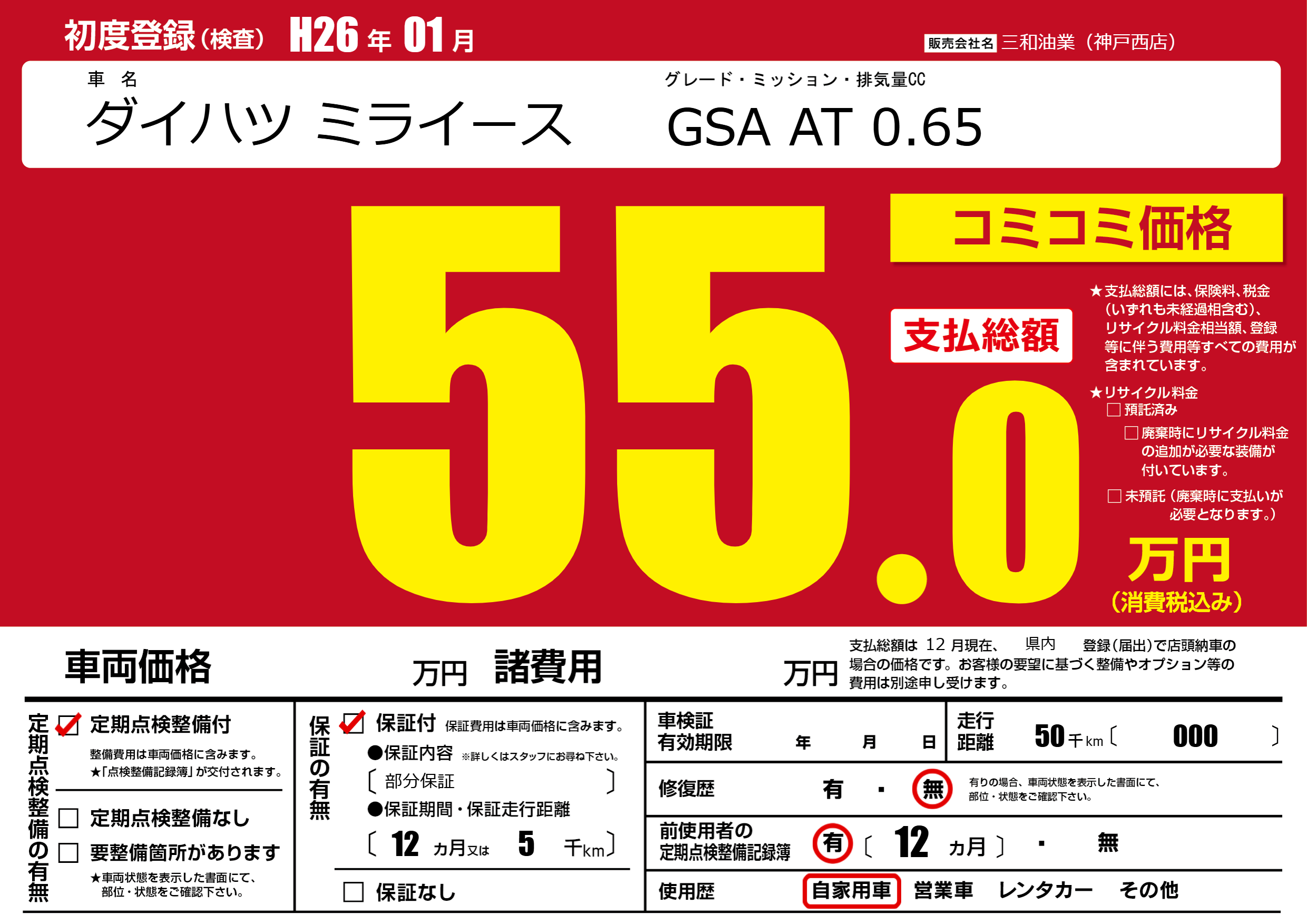| 走行キロ | 5万km | 初年度登録 | H26年01月 |