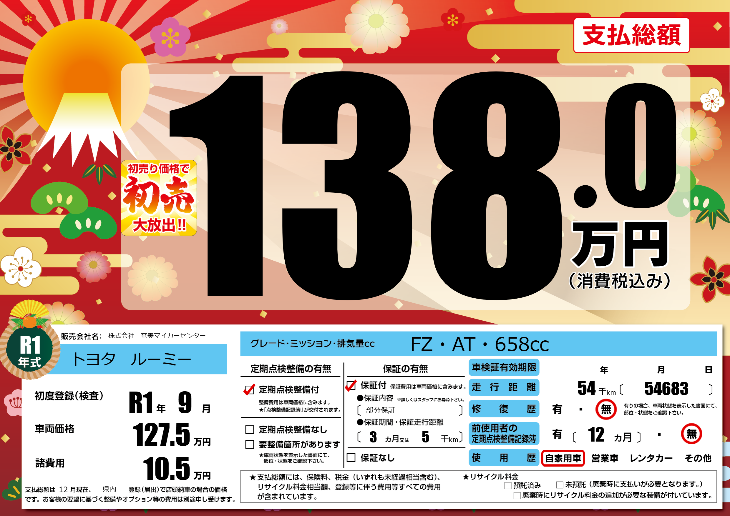 | 車名 | トヨタ ルーミー | グレード ミッション 排気量 |