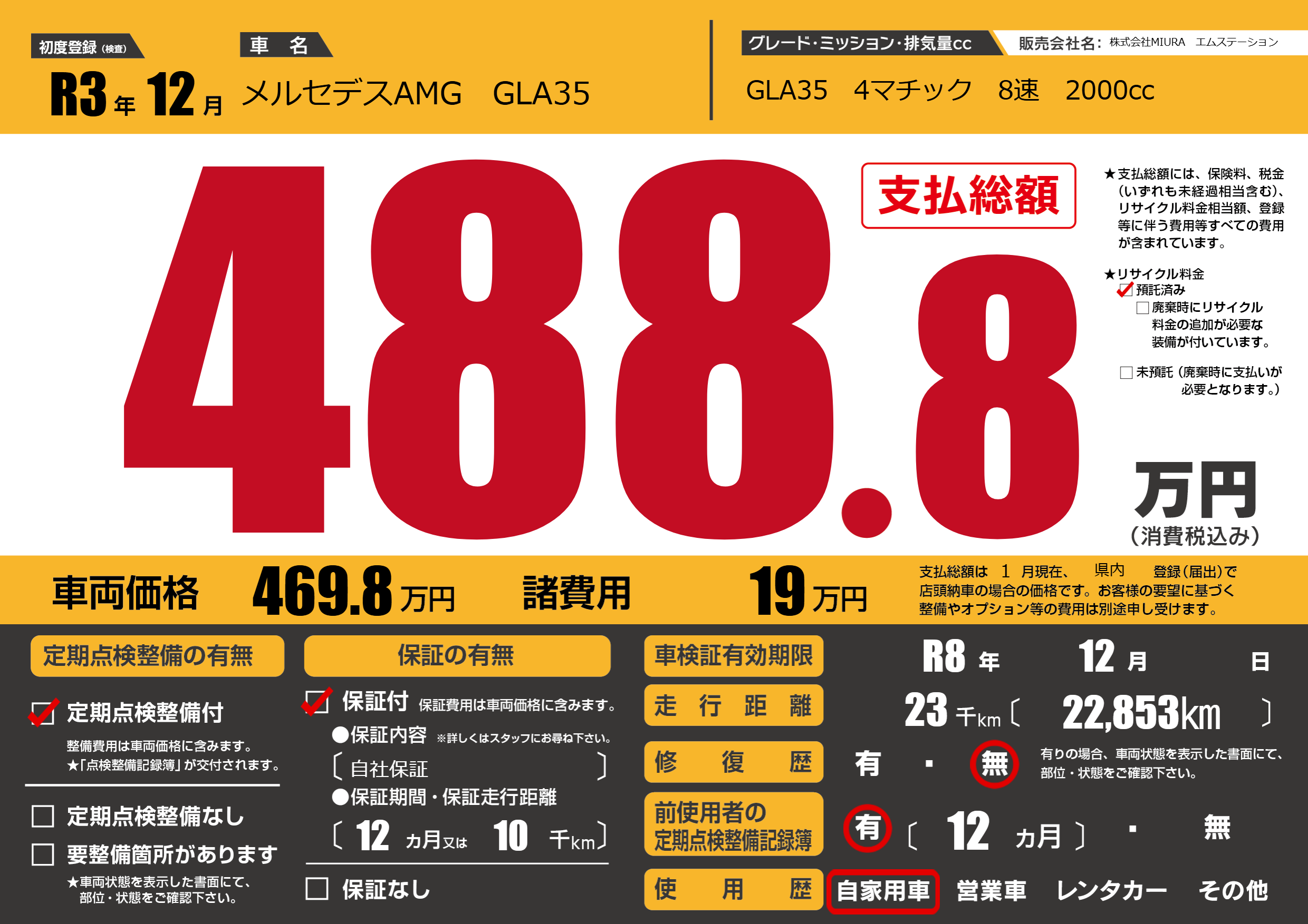 | 車名 | メルセデスAMG GLA35 | グレード ミッション 排気量 |