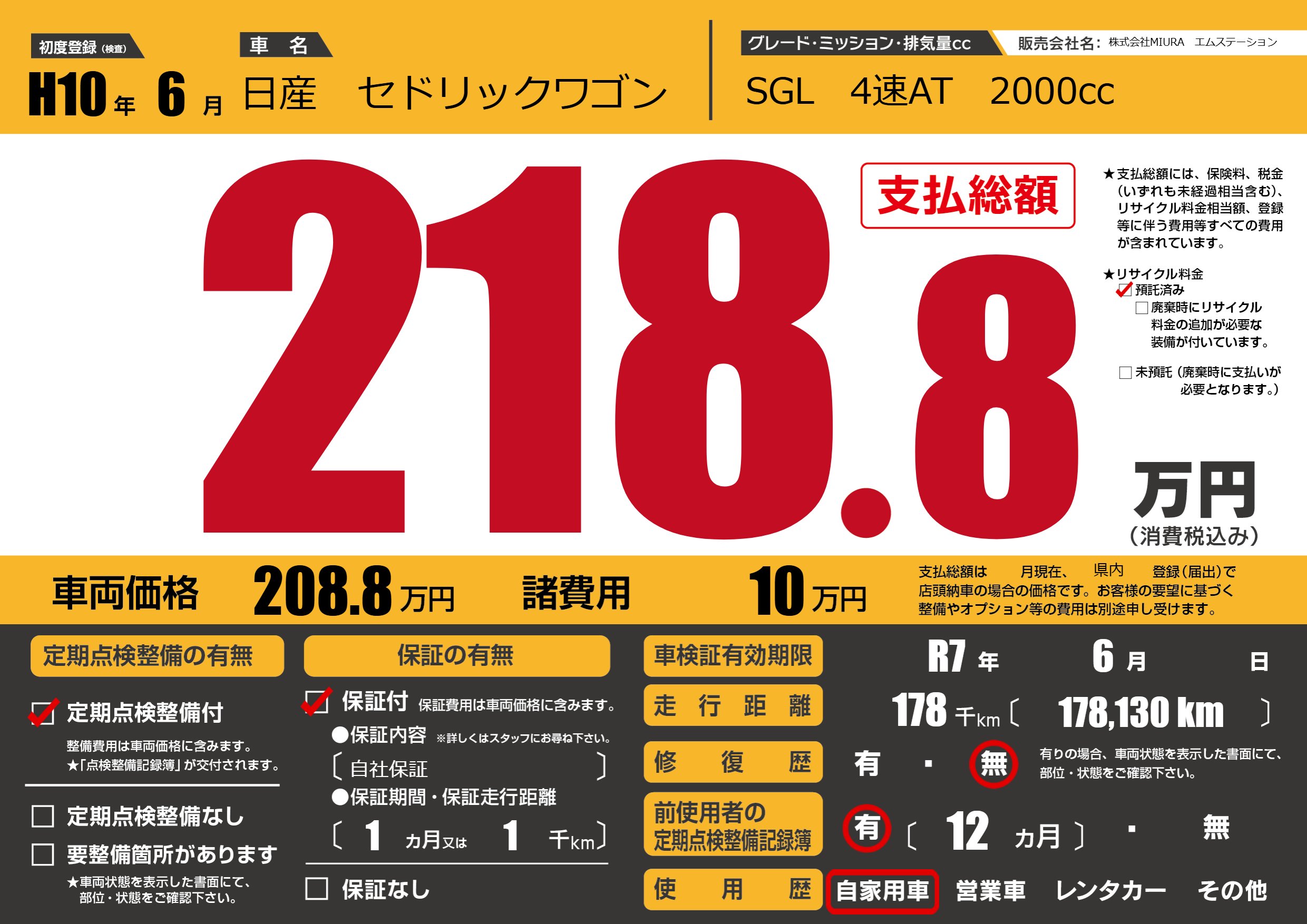 | 車名 | 日産 セドリックワゴン | グレード ミッション 排気量 |