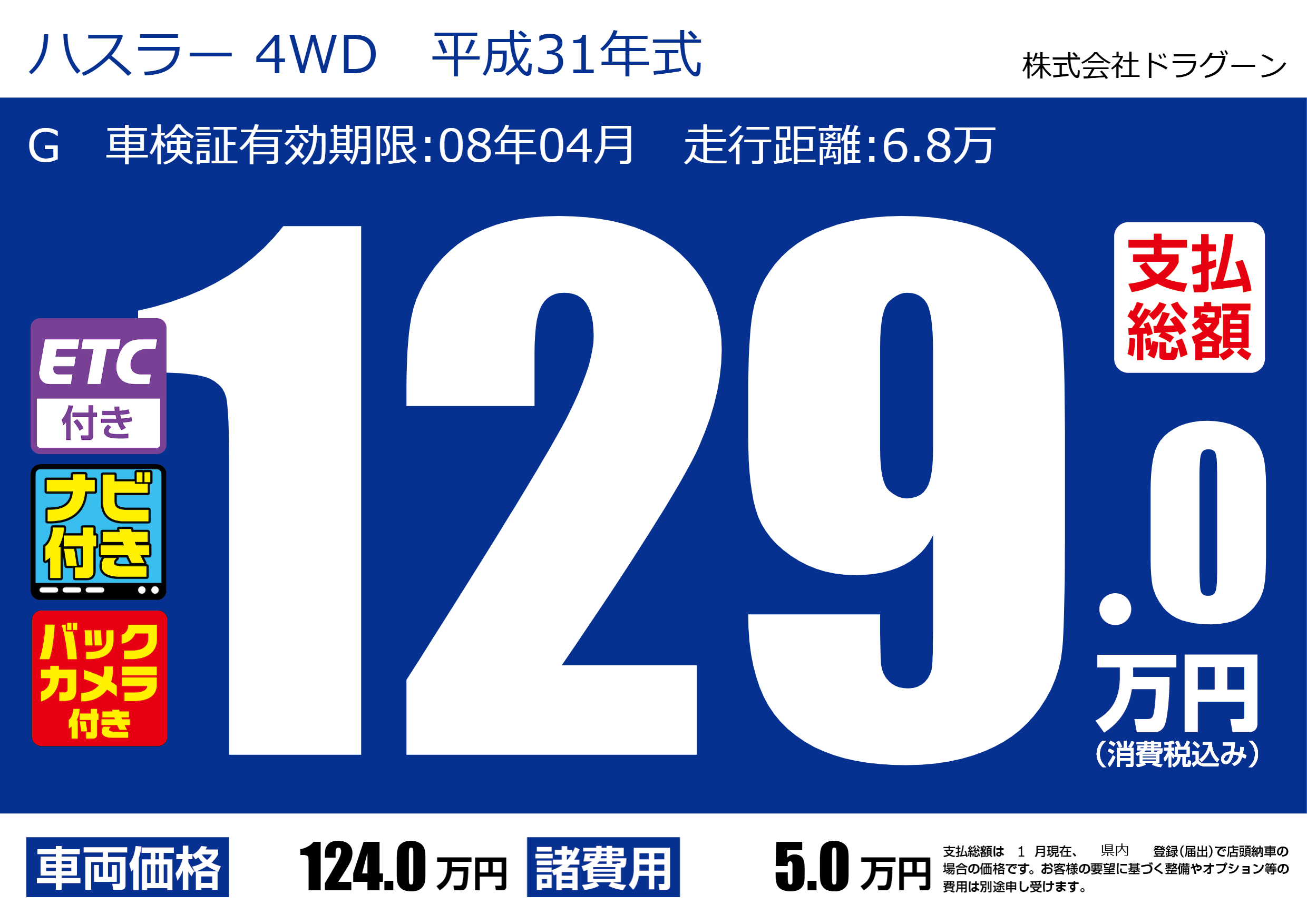 | 車名 | ハスラー 4WD 平成31年式 | グレード ミッション 排気量 |