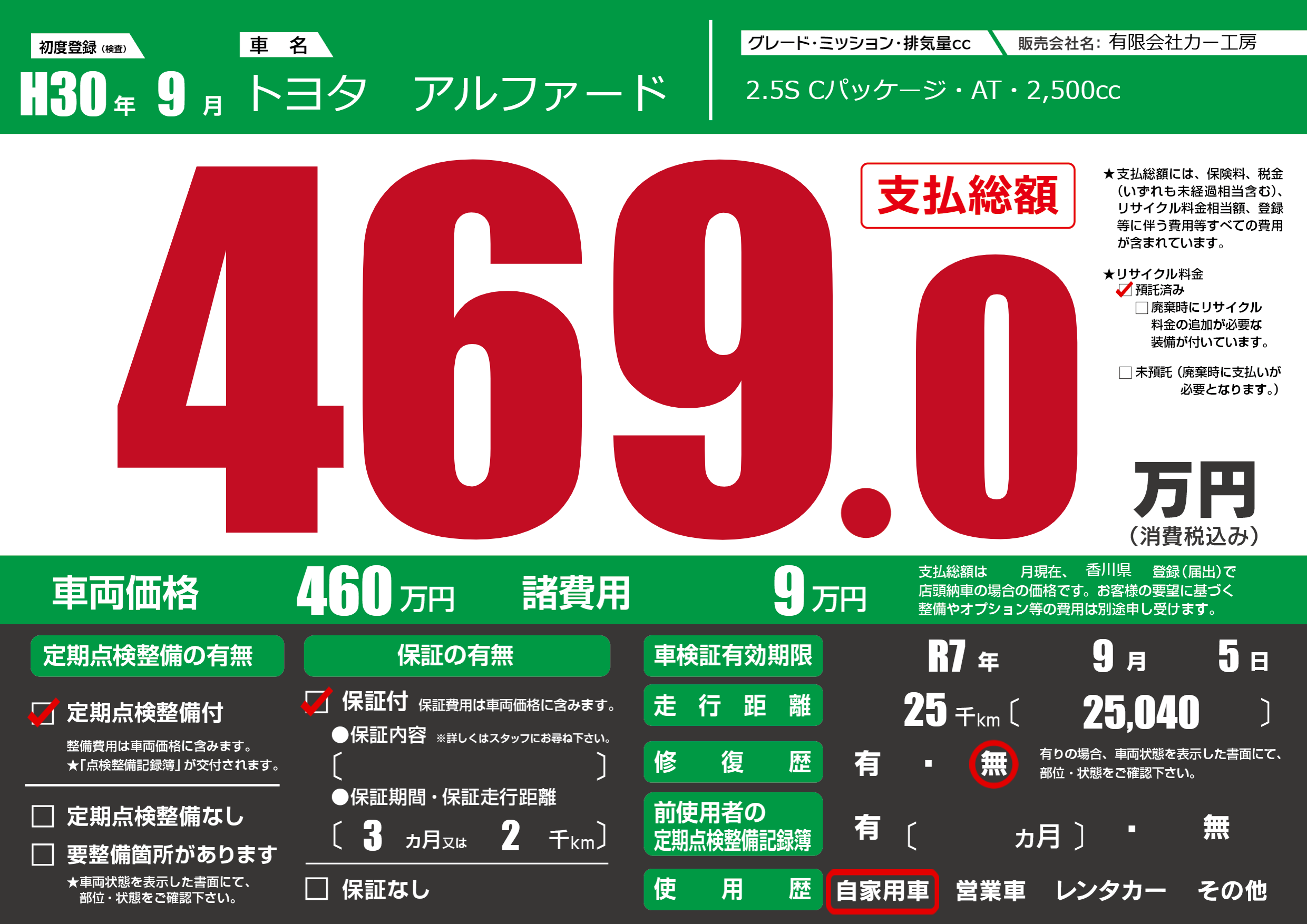 | 車名 | トヨタ アルファード | グレード ミッション 排気量 |