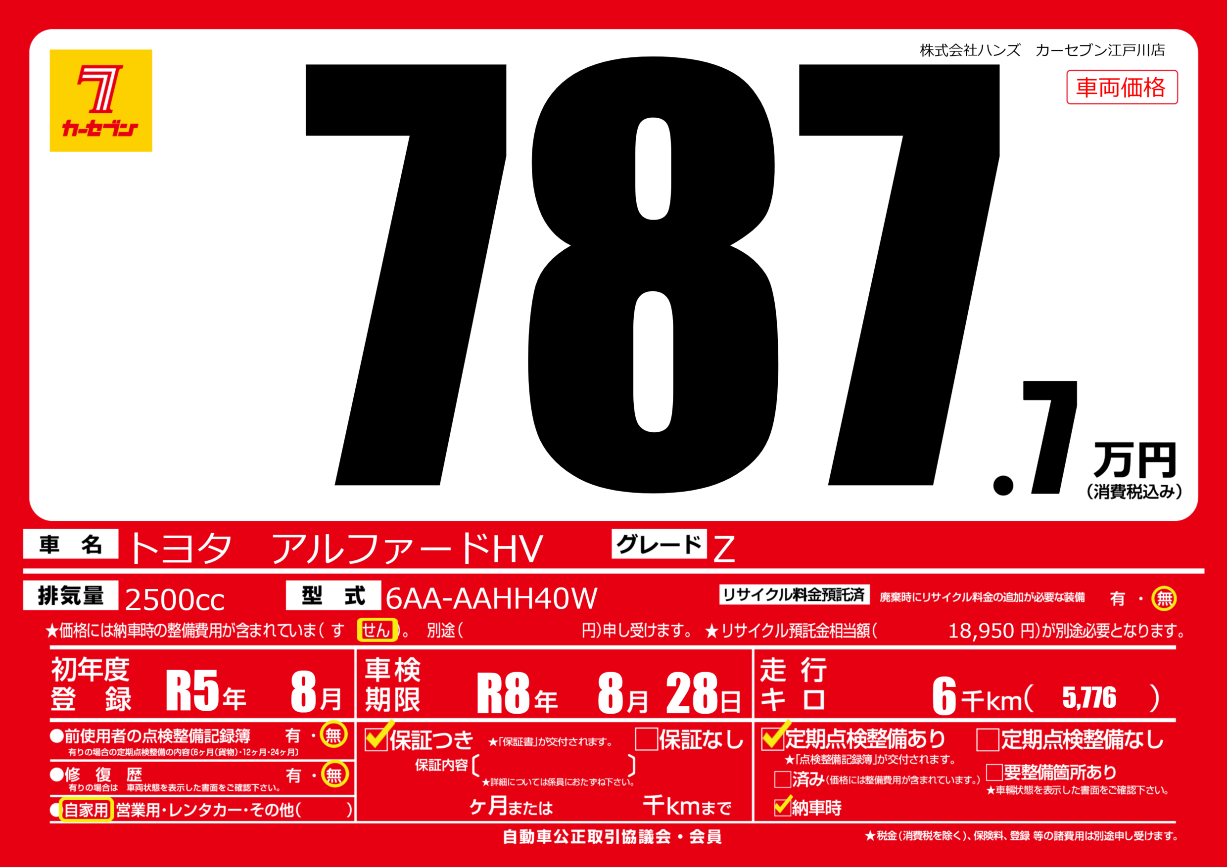 | 車名 | トヨタ アルファードHV | グレード ミッション 排気量 |