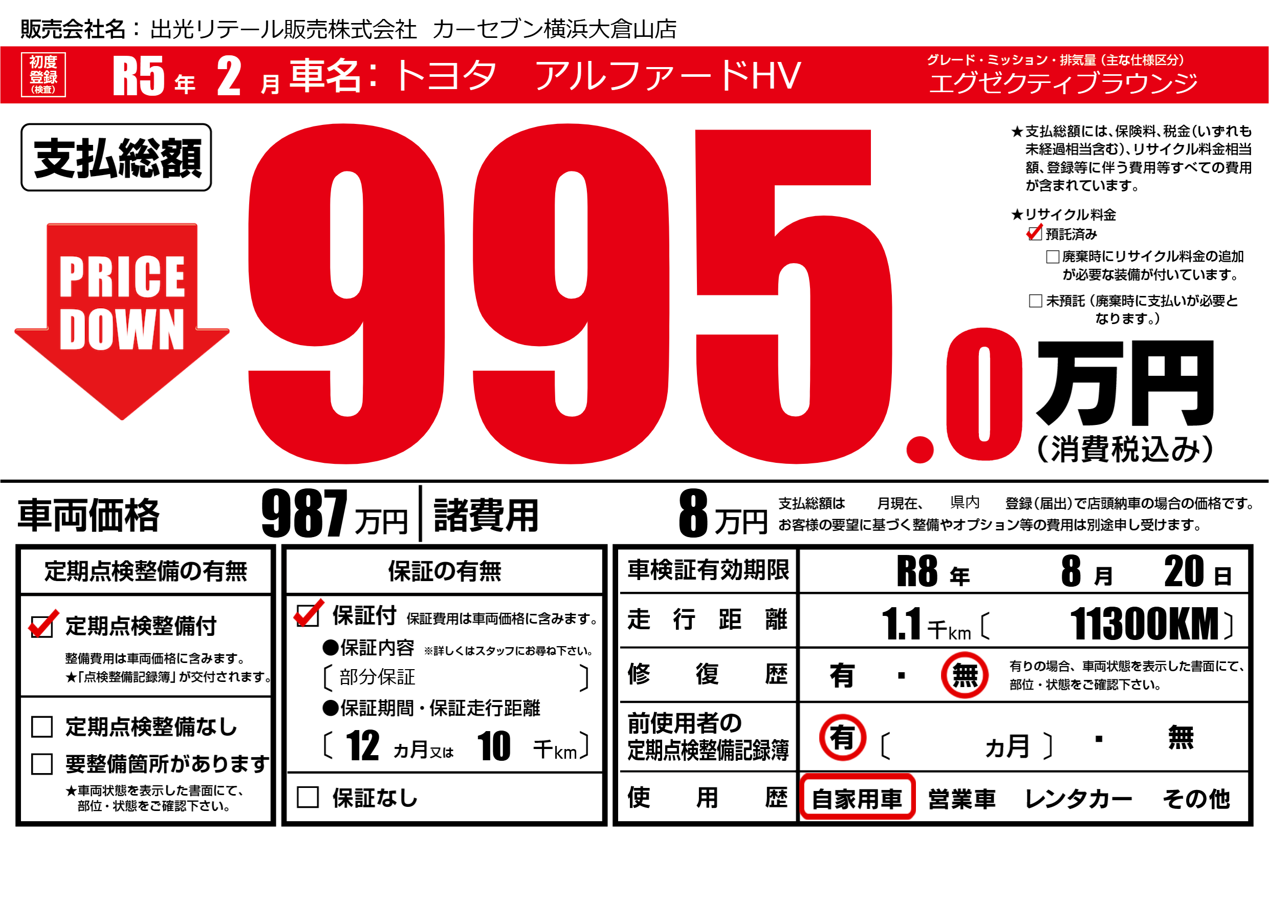 | 走行キロ | 0.1万km | 初年度登録 | R5年2月 |