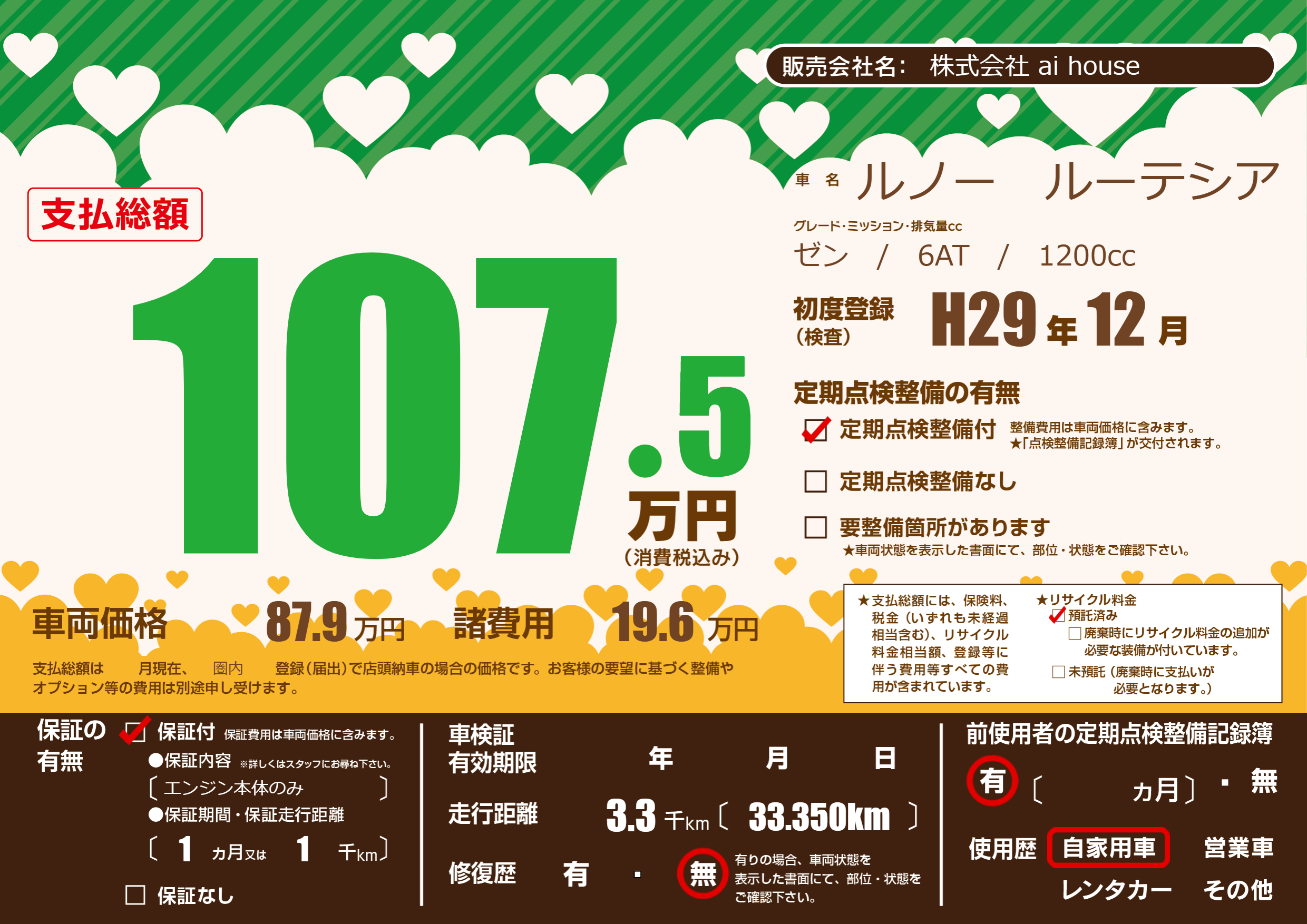 | 走行キロ | 0.3万km | 初年度登録 | H29年12月 |