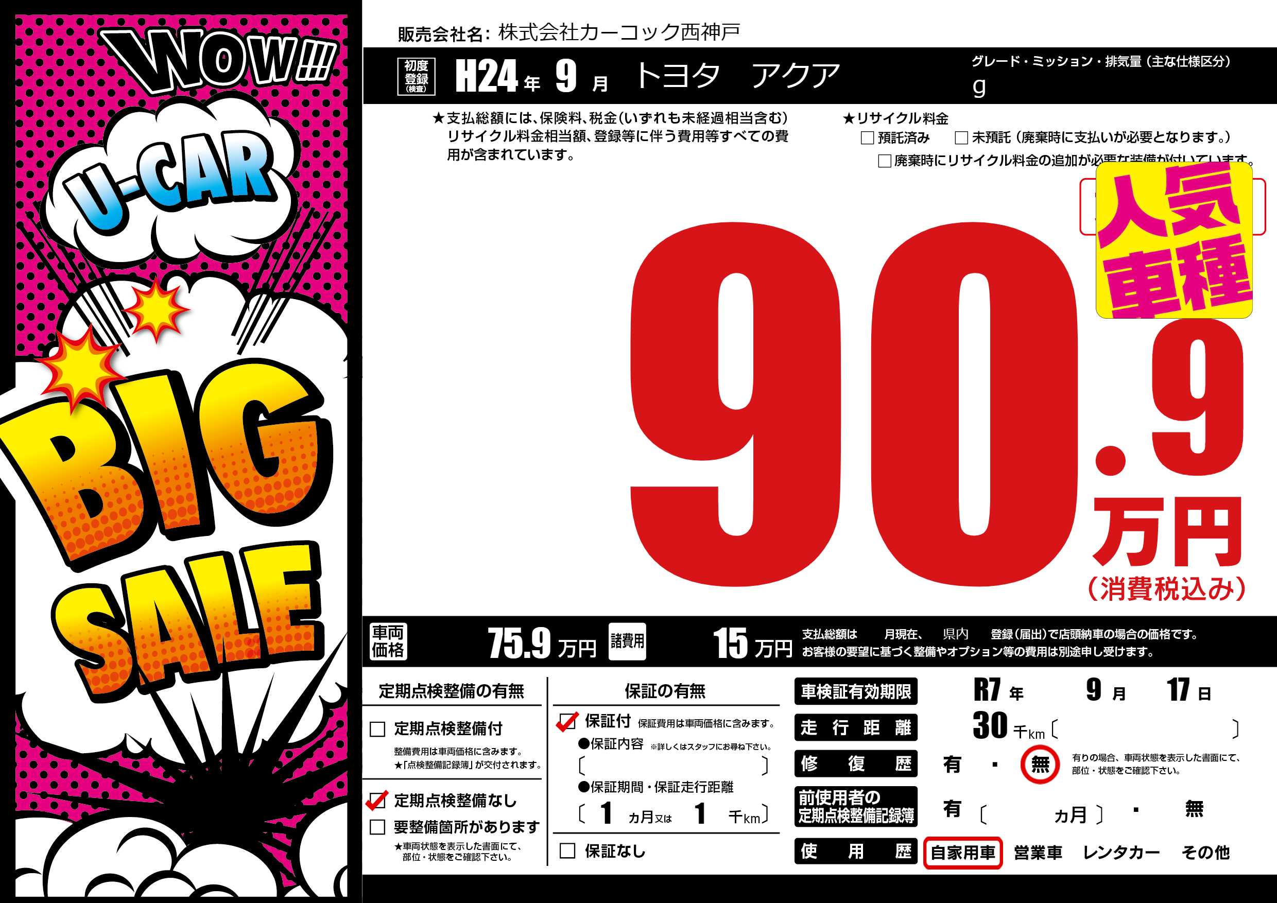 | 走行キロ | 3万km | 初年度登録 | H24年9月 |