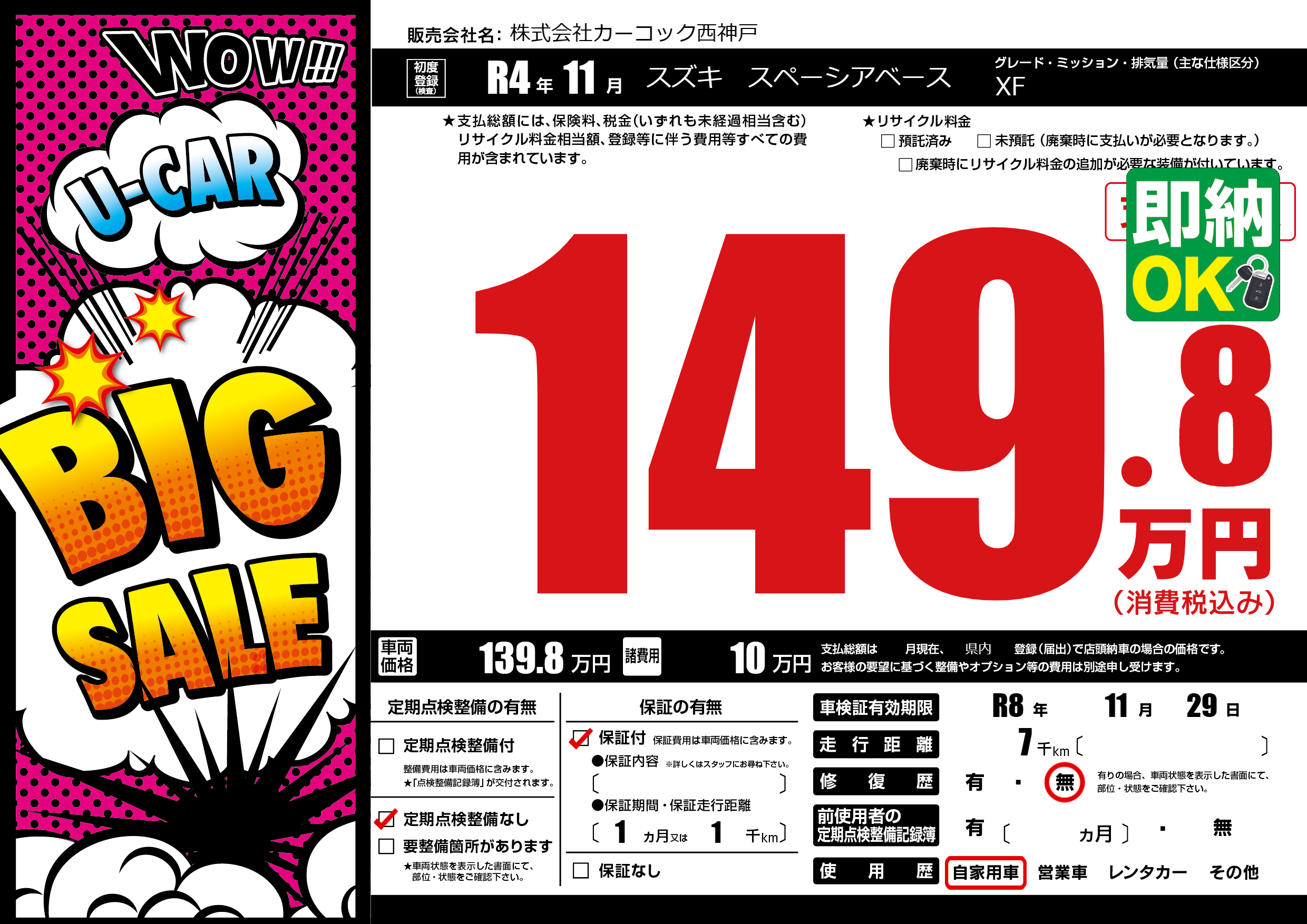 | 走行キロ | 0.7万km | 初年度登録 | R4年11月 |