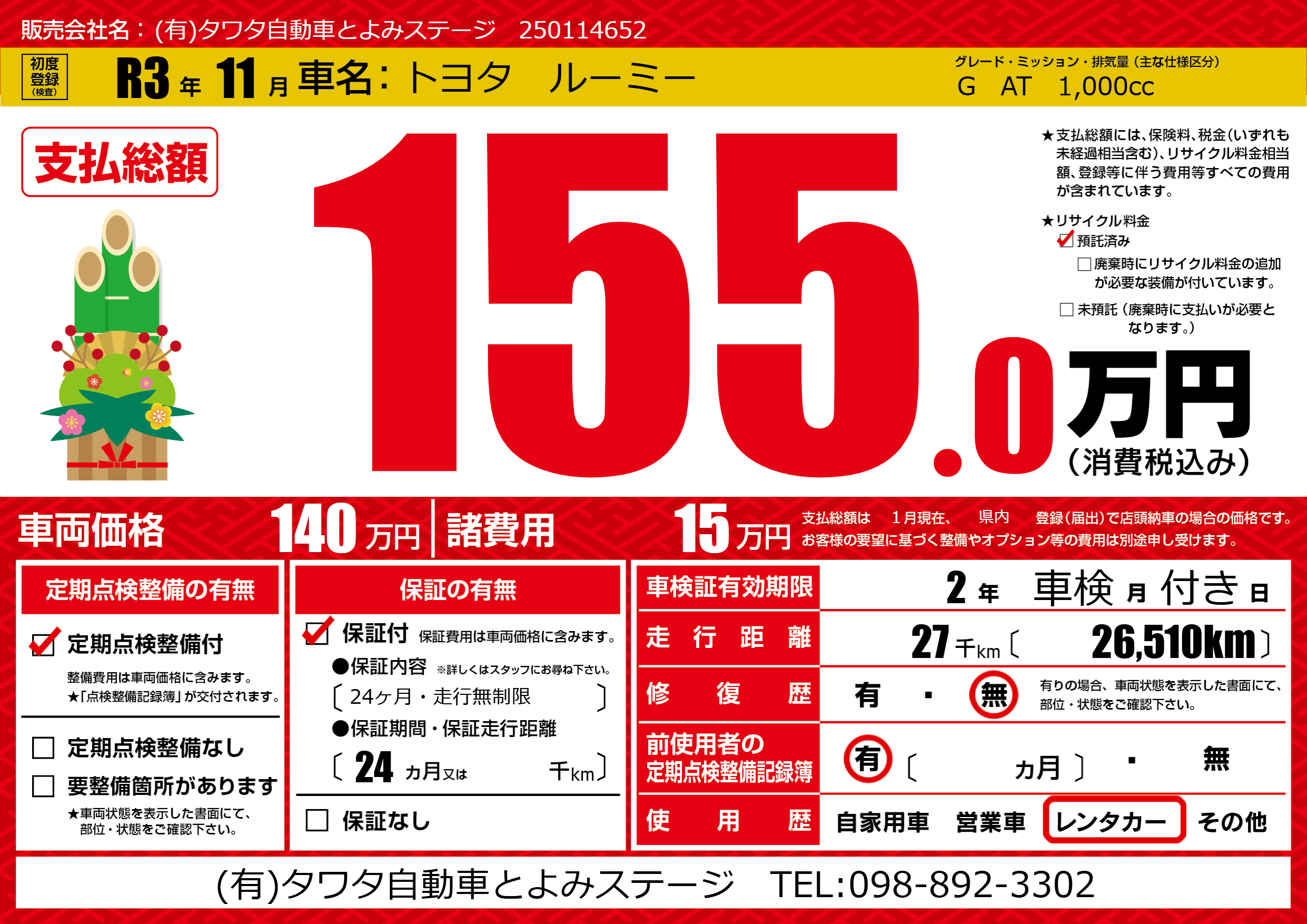 | 走行キロ | 2.7万km | 初年度登録 | R3年11月 |