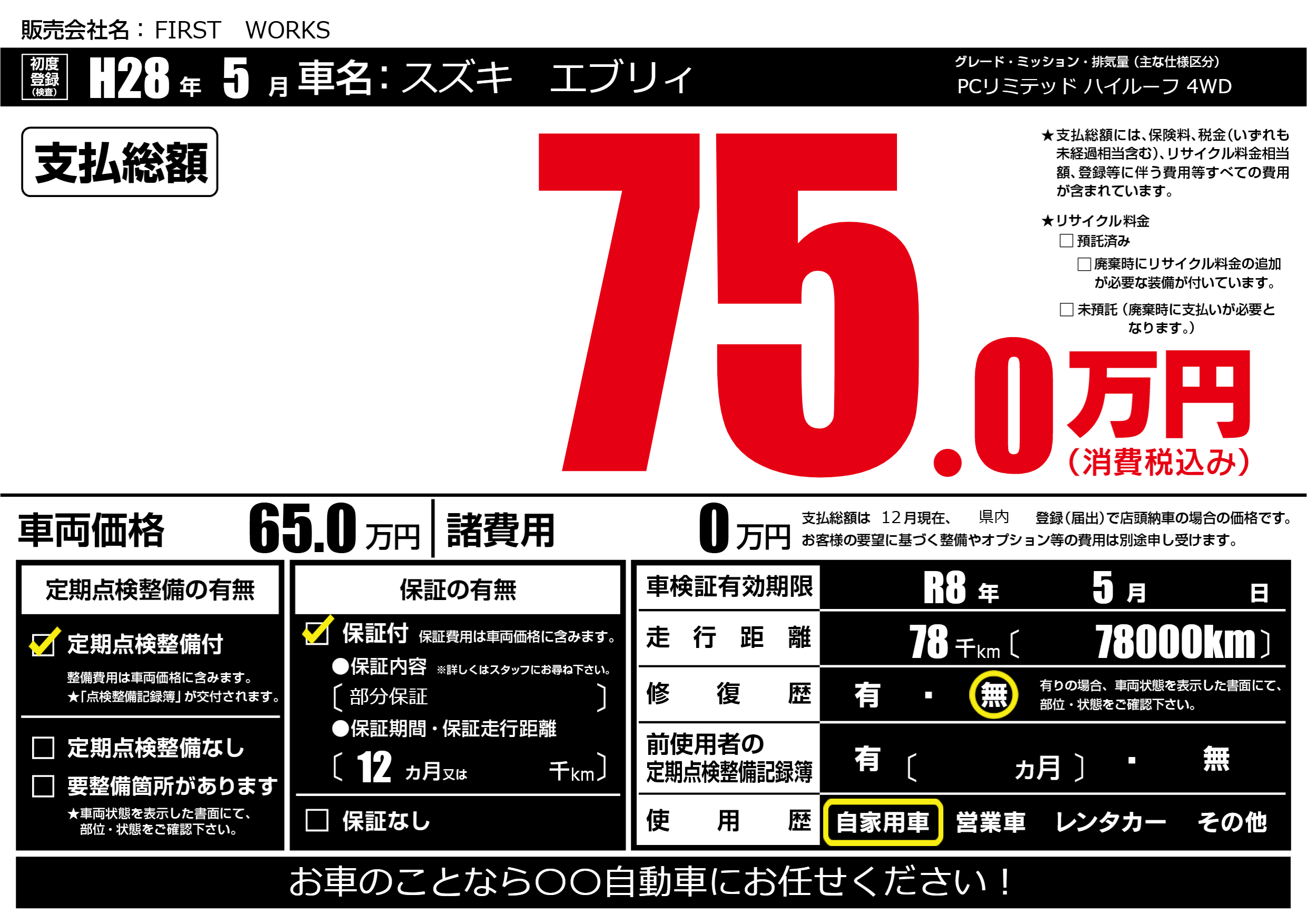 | 走行キロ | 7.8万km | 初年度登録 | H28年5月 |