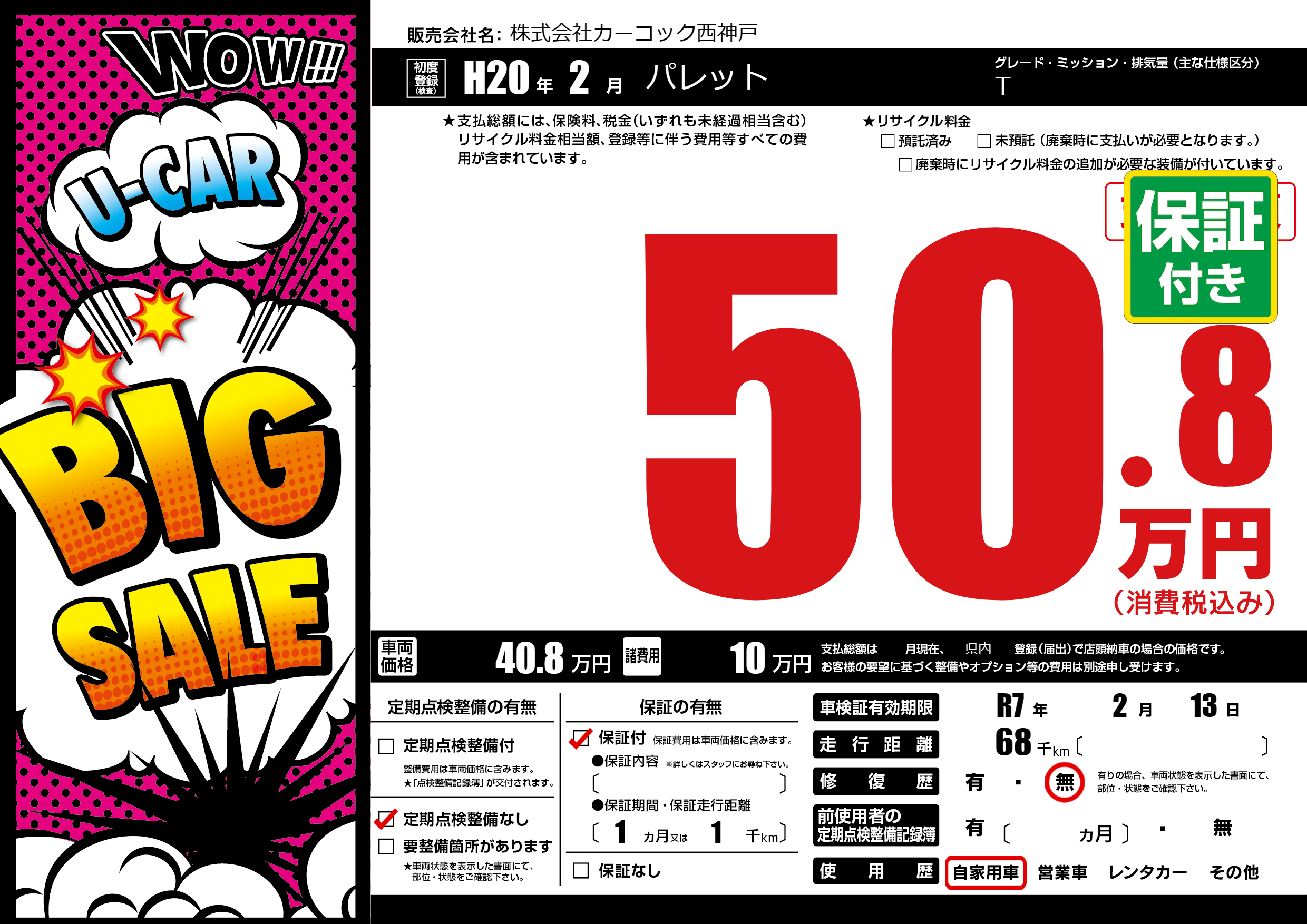 | 走行キロ | 6.8万km | 初年度登録 | H20年2月 |