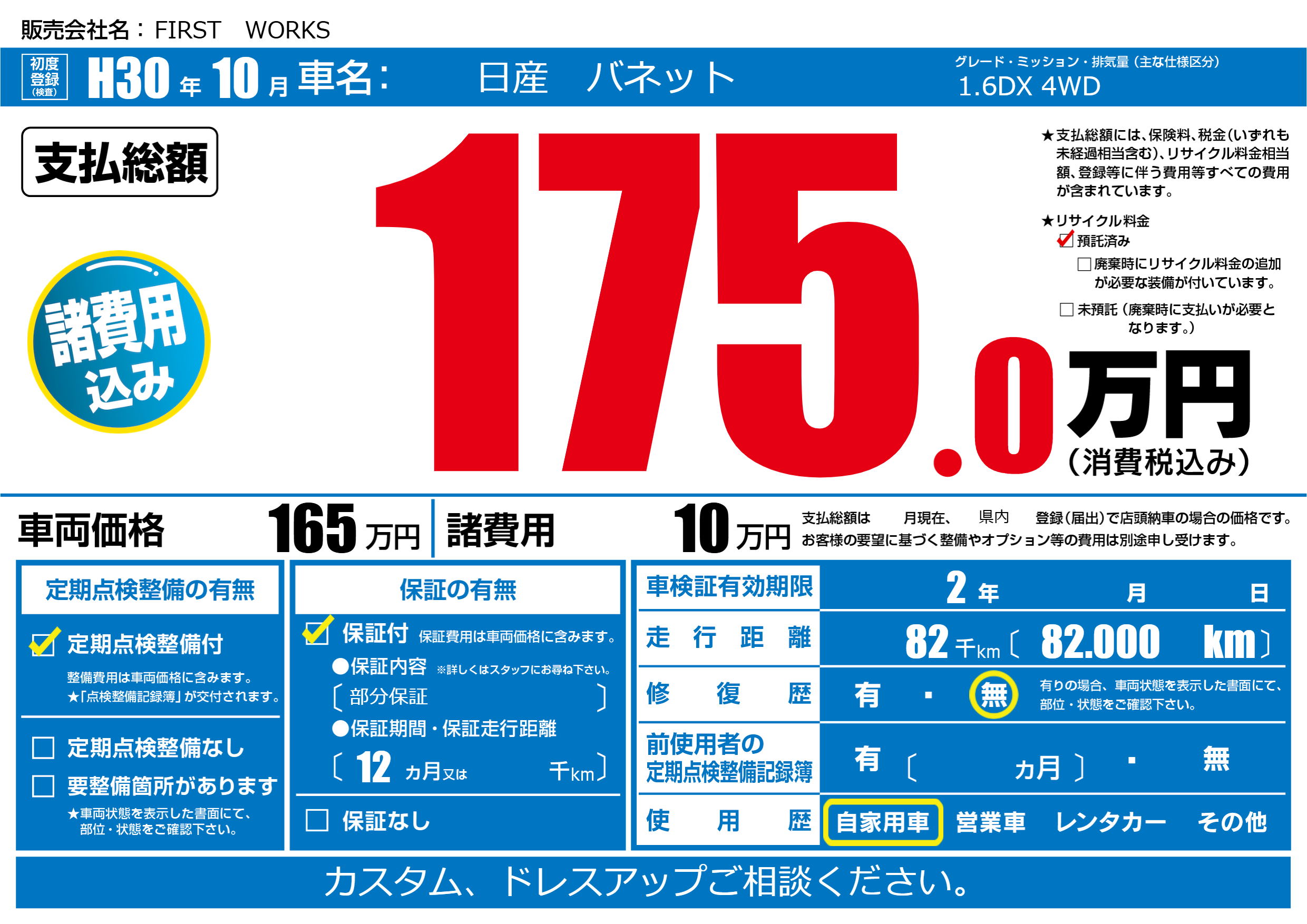 | 車名 | 日産 バネット | グレード ミッション 排気量 |