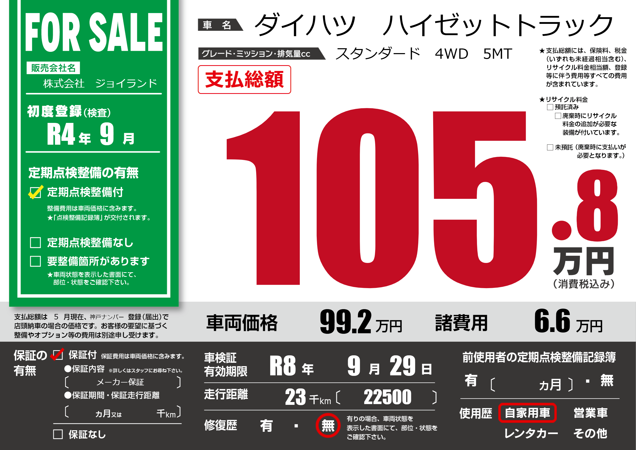 保証付き 保証内容( メーカー保証) ---ヶ月または()千kmまで |