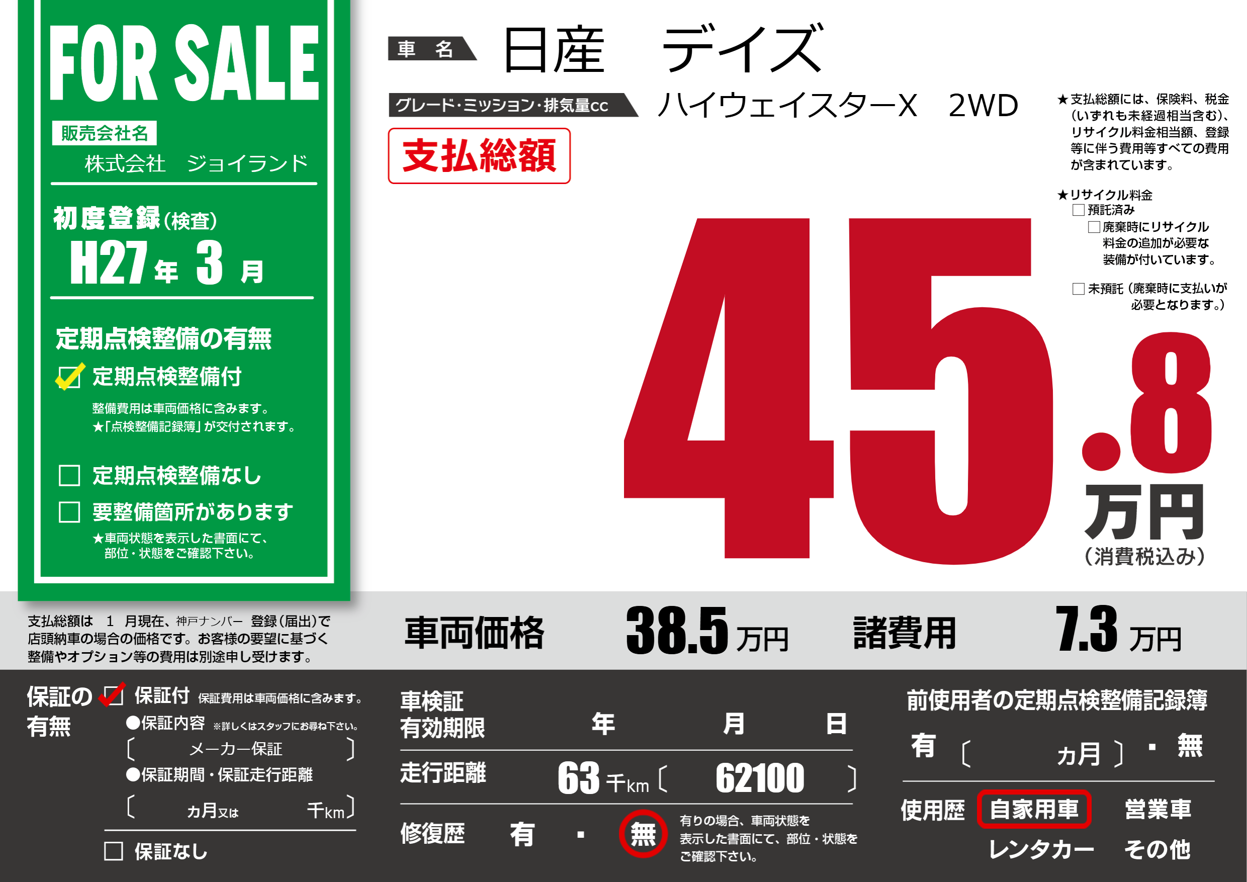 | 走行キロ | 6.3万km | 初年度登録 | H27年3月 |