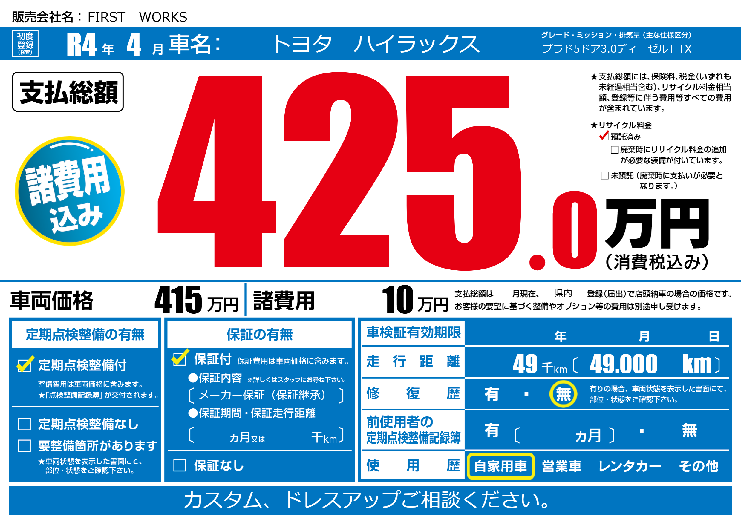 | 走行キロ | 4.9万km | 初年度登録 | R4年4月 |