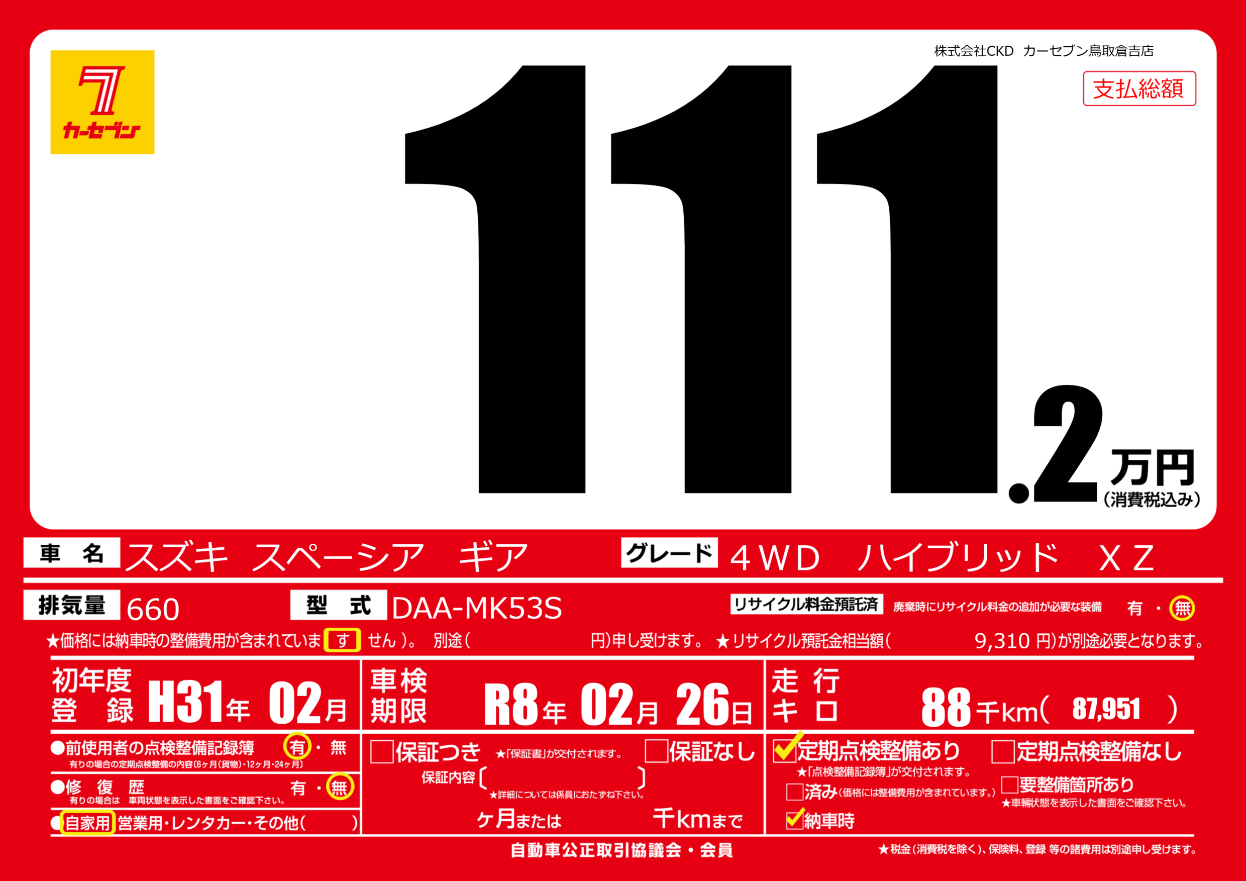 | 定期点検整備 | 定期点検整備あり 納車時あり | ||
